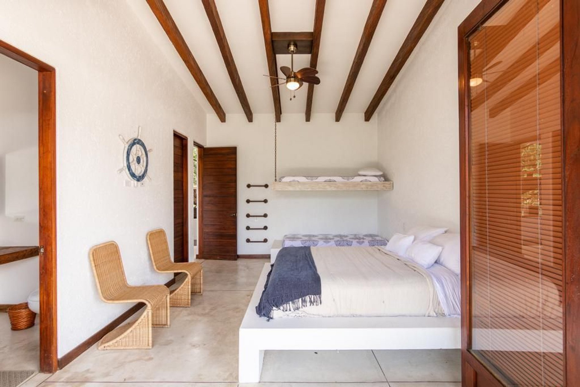 Viva a elegância rústica em meio à vegetação exuberante e colorida. Cada um dos cinco quartos, todos com banheiro privativo, se abre para um jardim gramado com palmeiras. A cozinha em conceito aberto e a sala de estar se integram perfeitamente à piscina infinita e ao jacuzzi, rodeados de espreguiçadeiras e redes — o cenário perfeito para cochilos à tarde. Desconecte-se do barulho do mundo e sintonize com o seu próprio ritmo com o sistema de som embutido.