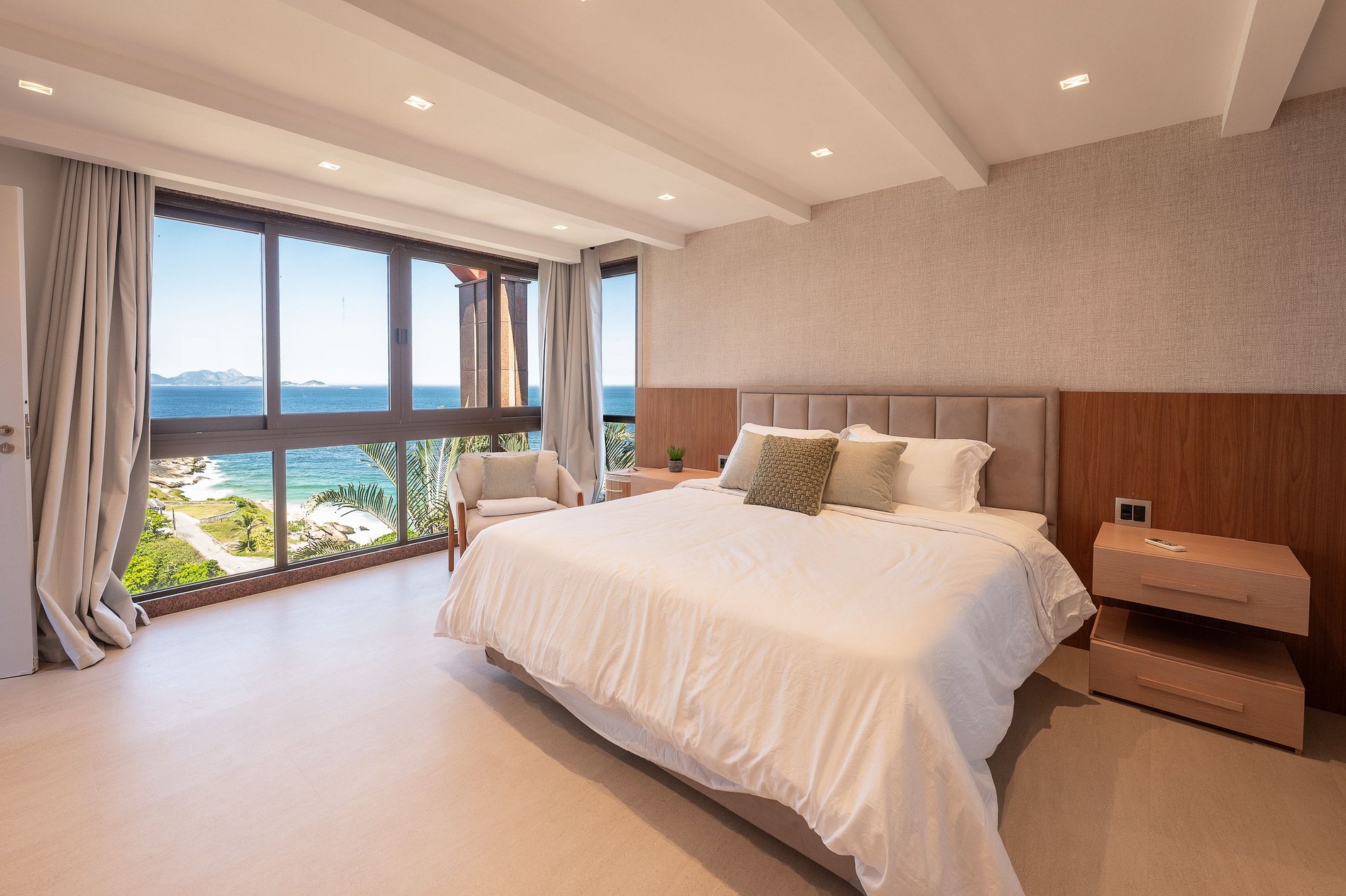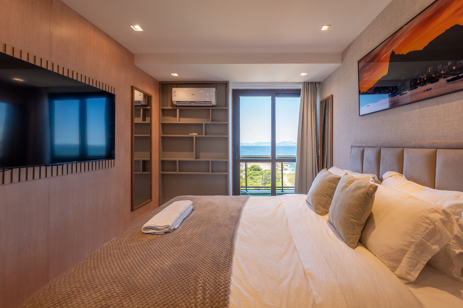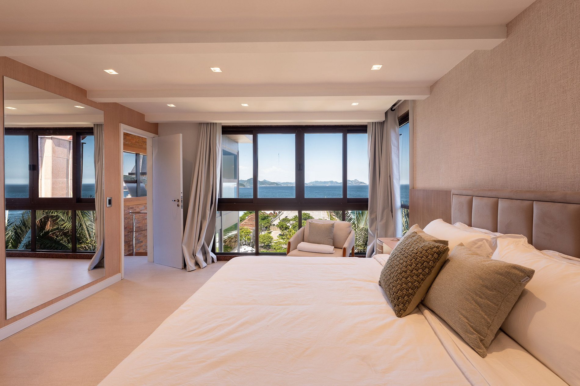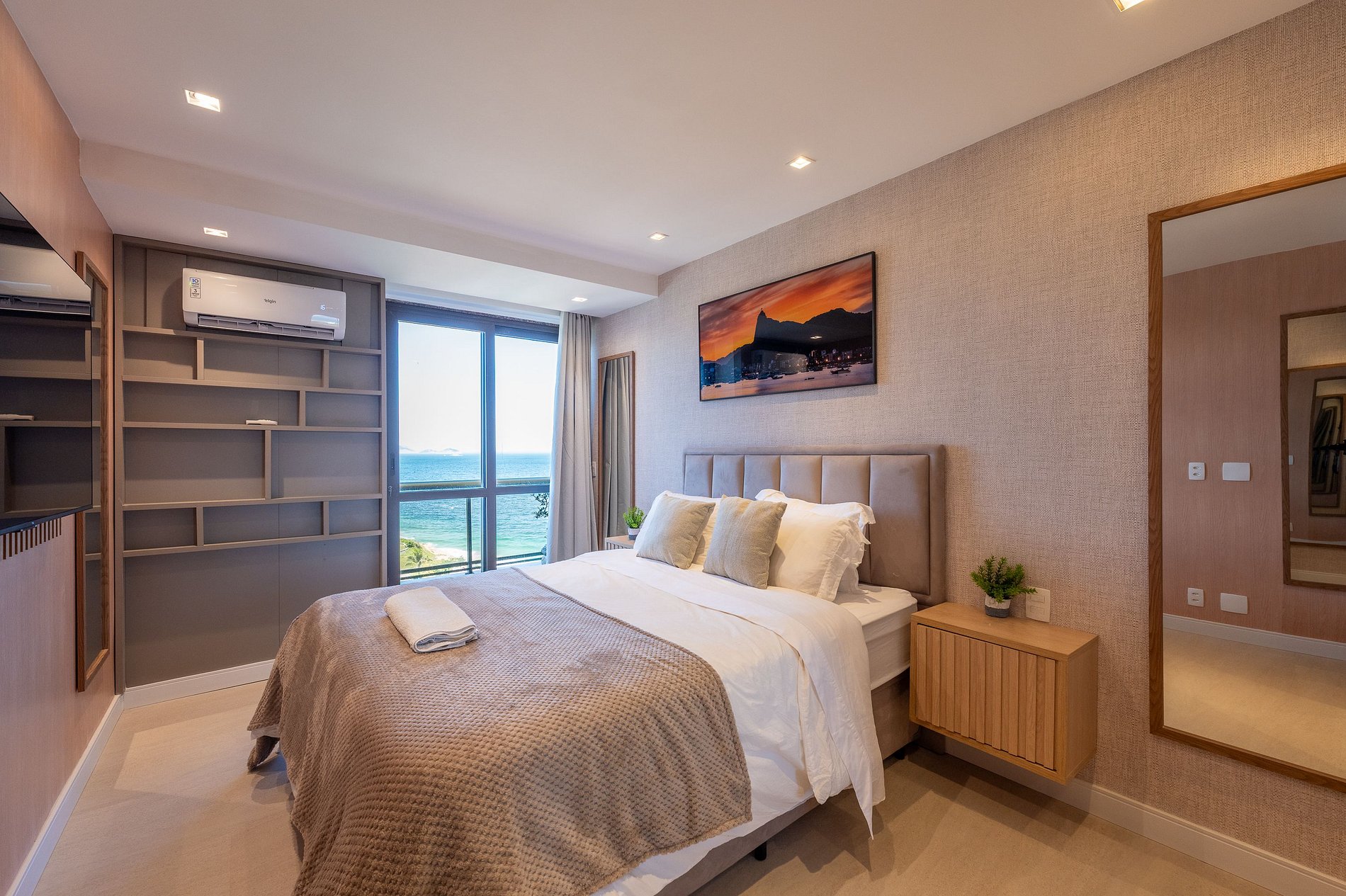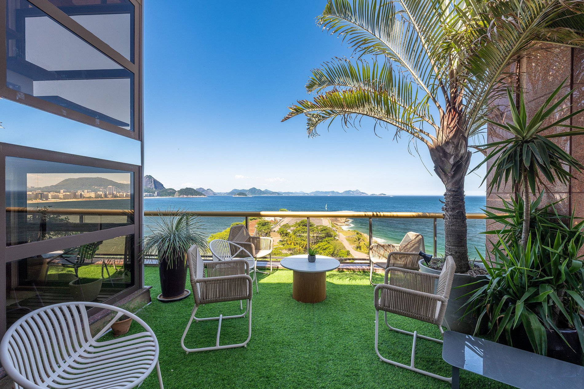O apartamento dispõe de três suítes amplas, todas com vistas deslumbrantes para o mar, a Baía de Copacabana e o Pão de Açúcar. Todos os ambientes, sem exceção, desfrutam de panoramas abertos e de uma luminosidade natural excepcional.