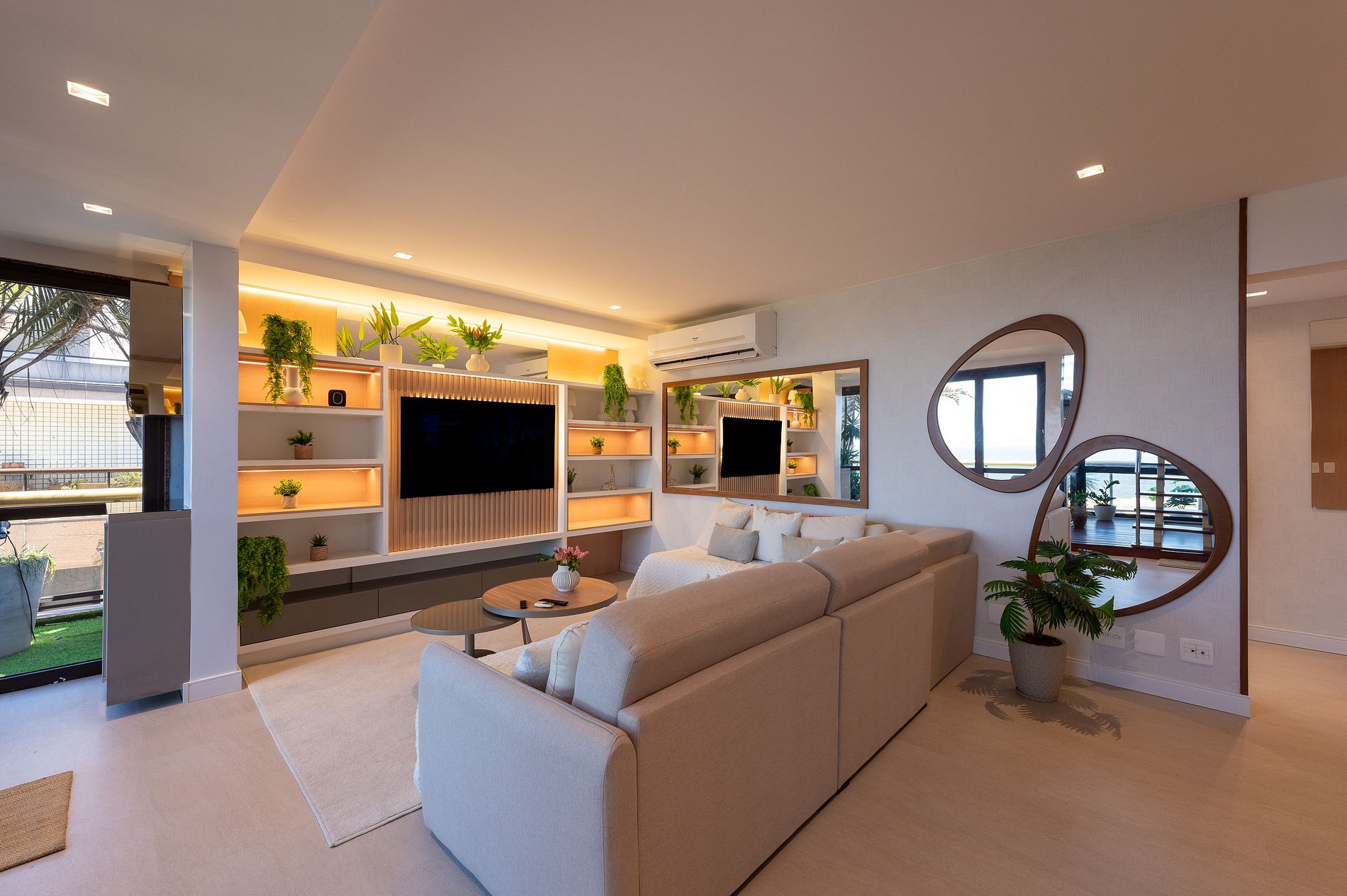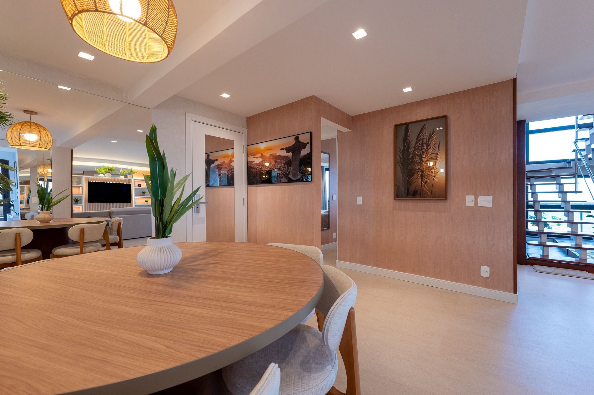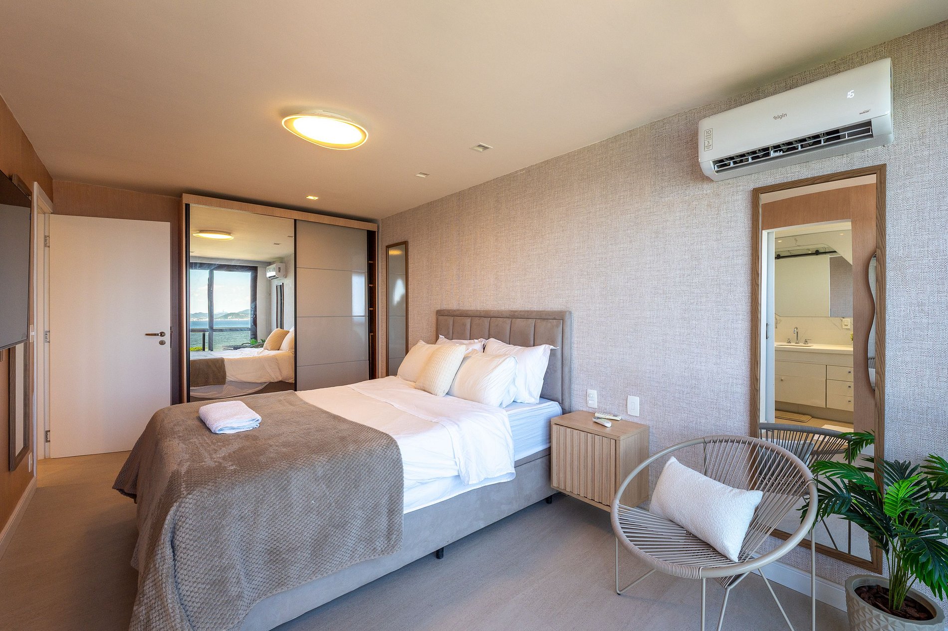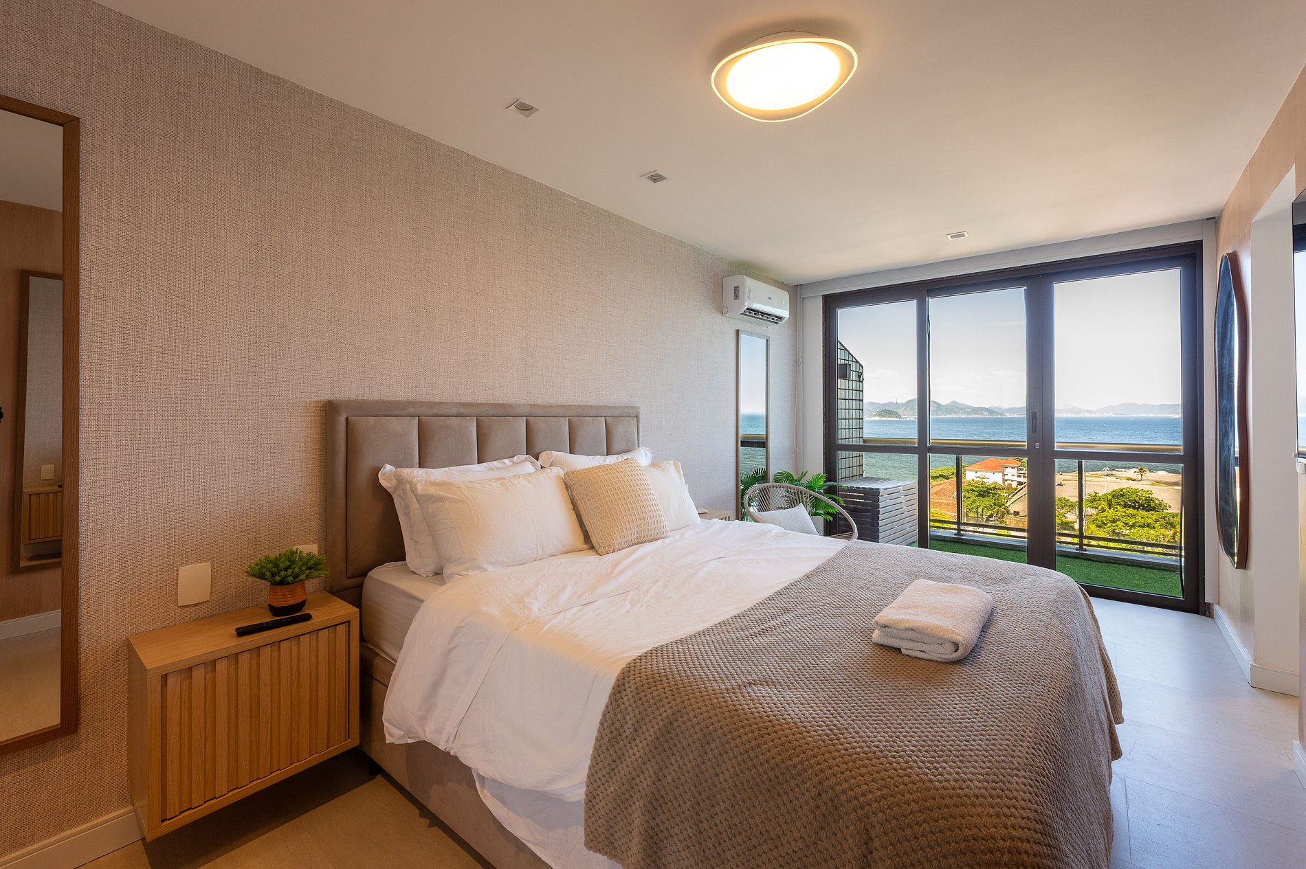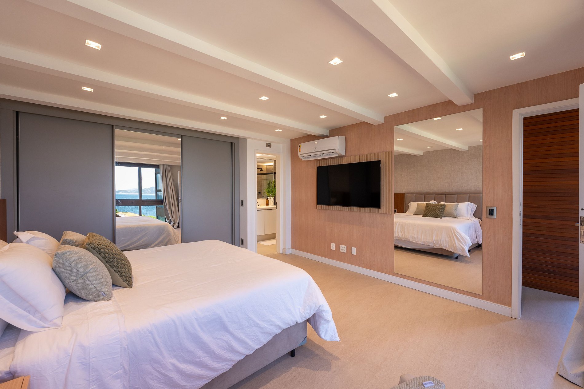 O apartamento dispõe de três suítes amplas, todas com vistas deslumbrantes para o mar, a Baía de Copacabana e o Pão de Açúcar. Todos os ambientes, sem exceção, desfrutam de panoramas abertos e de uma luminosidade natural excepcional.