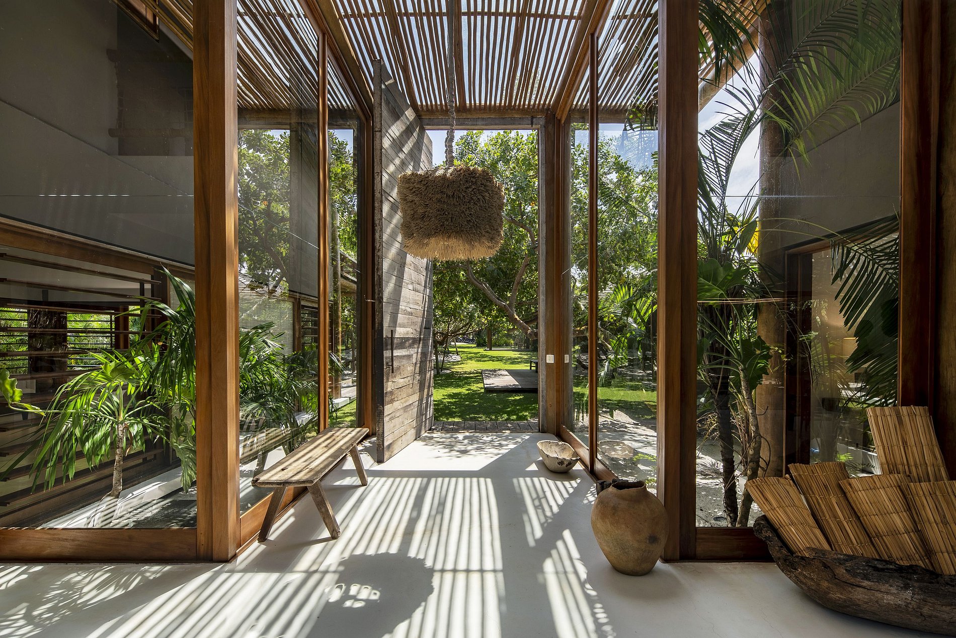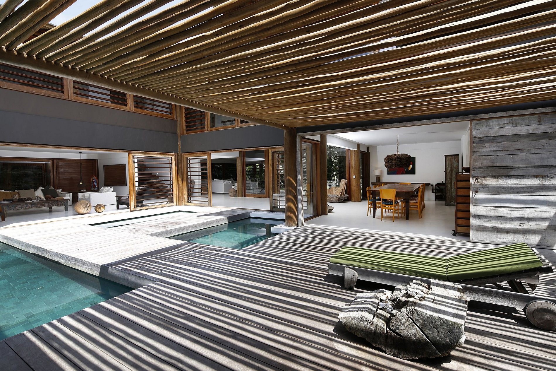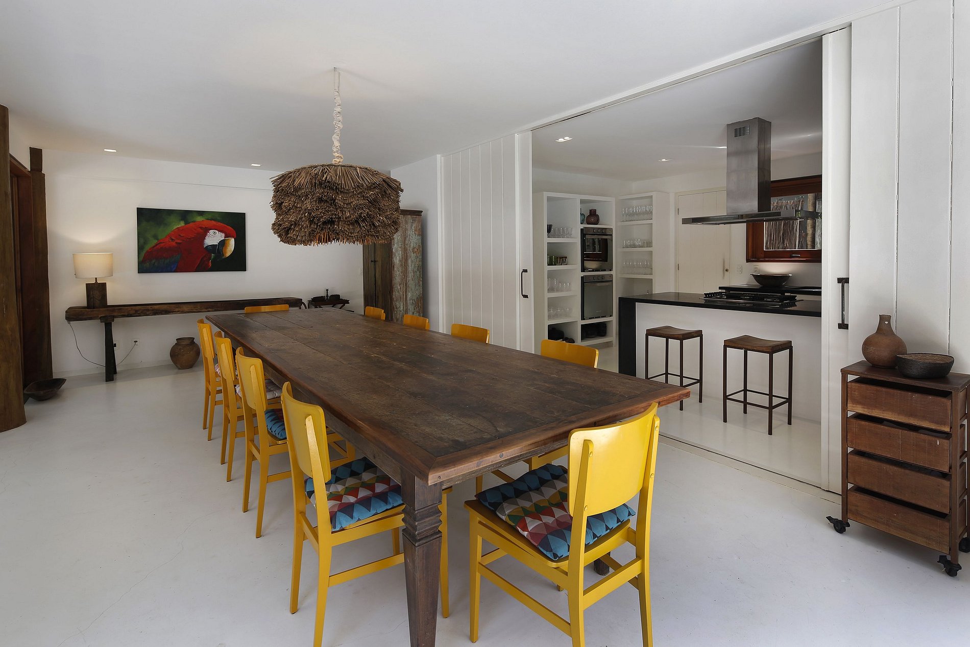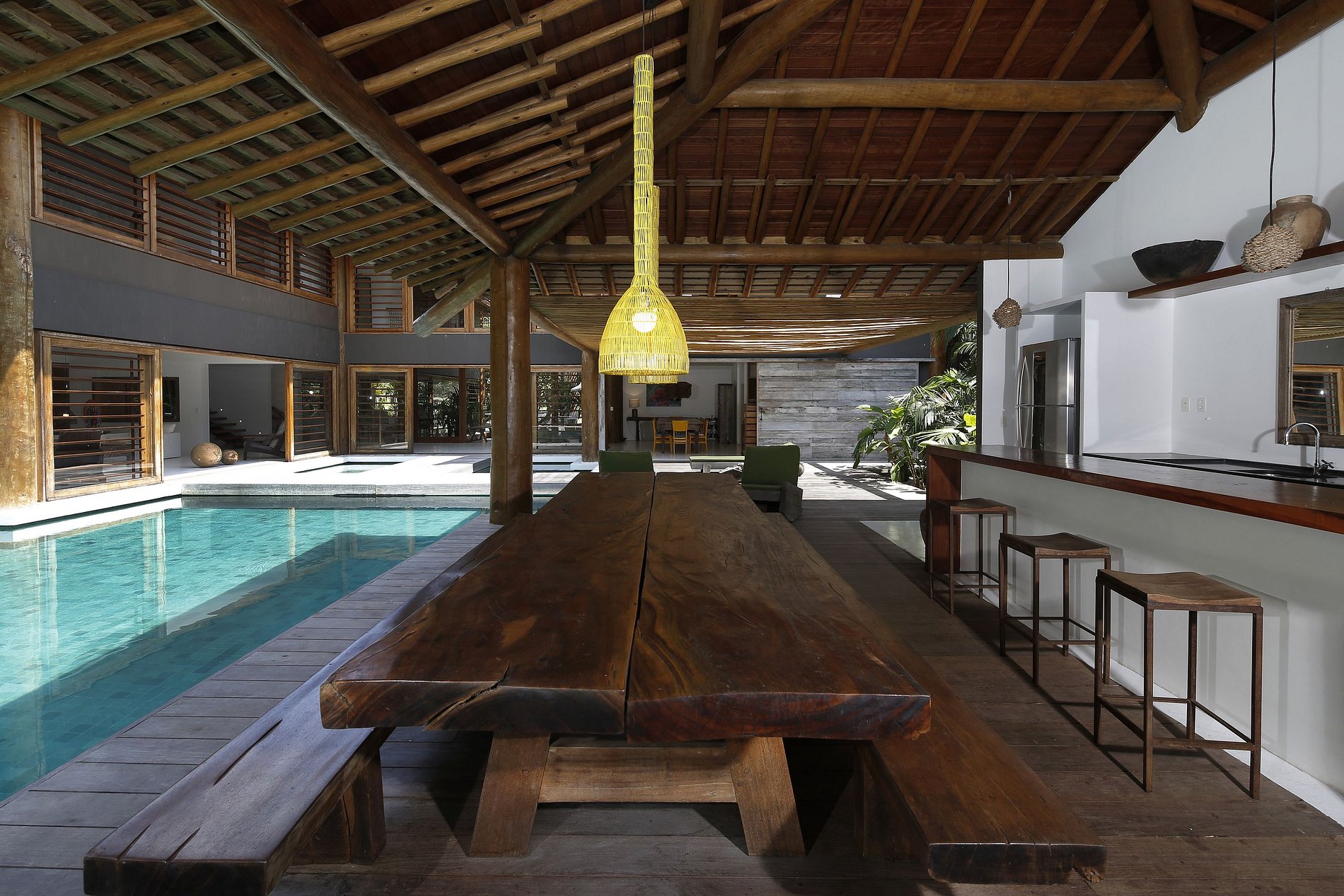 As duas salas são interligadas com a sala de jantar, a cozinha moderna e a área gourmet por uma graciosa passarela de madeira passando em cima da piscina. Todos esses espaços estão abertos para a piscina e o jardim tropical.