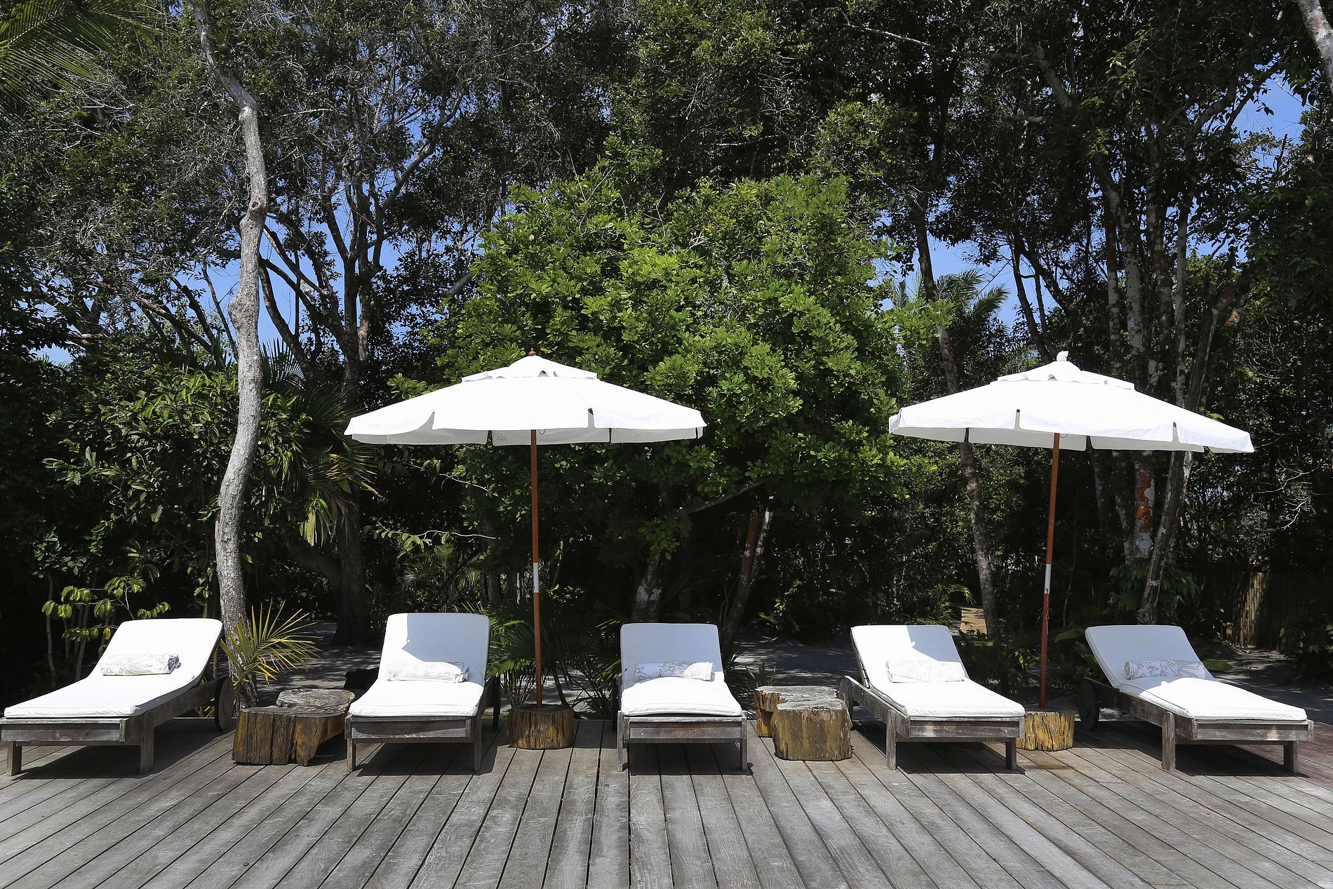 A delicada pérgola do apoio de praia, com espreguiçadeiras na área branca, fica a dois passos de uma água cristalina, morna a qualquer época do ano.Itapororoca é uma das praias mais exclusivas de Trancoso, longa de 7km com poucas casas e grande áreas preservada, o acesso se faz pela praia ou uma estrada sem saída com acesso vigiado 24h.