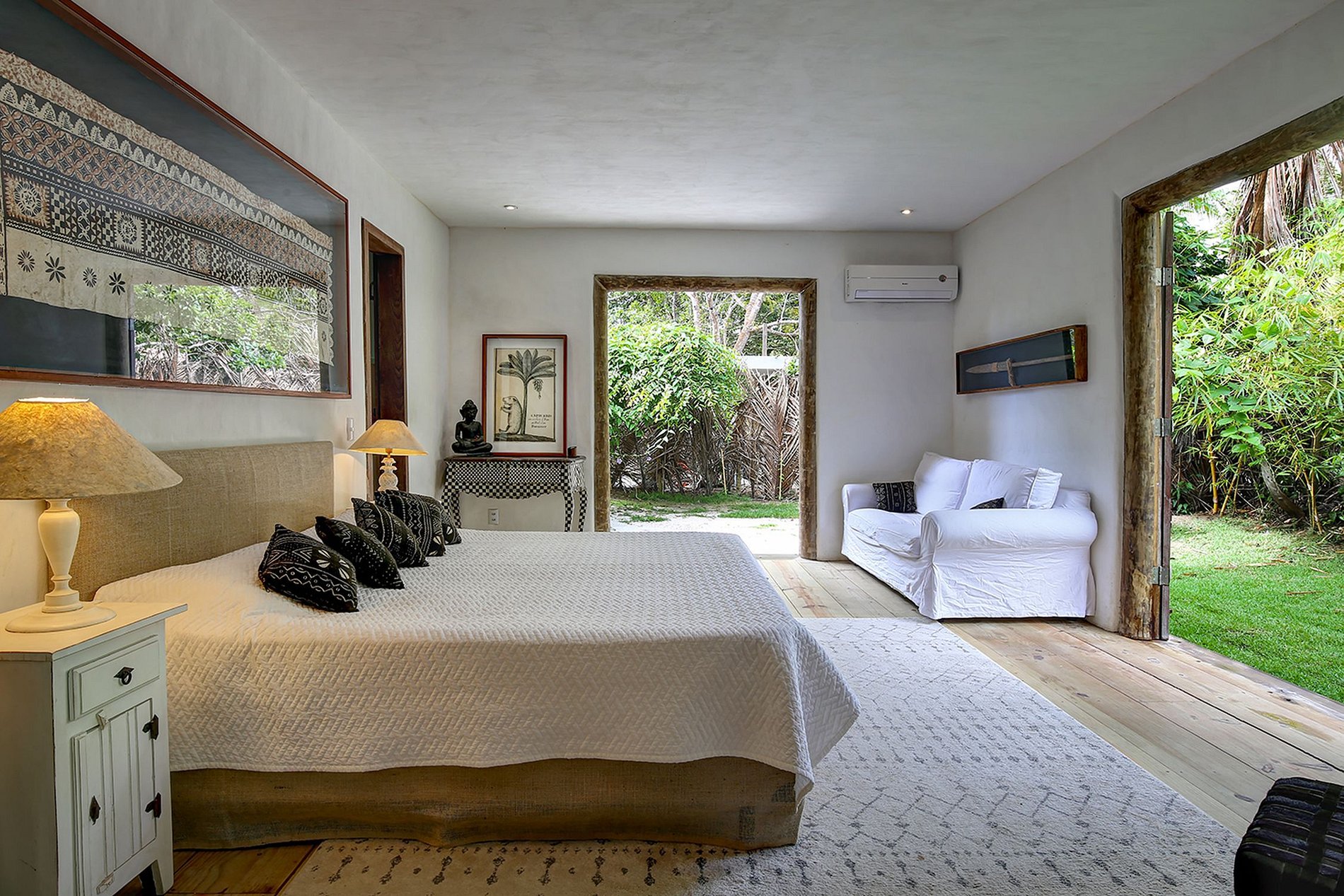A casa transmite atmosfera que ambienta entre a praia e o campo. Assoalho de madeira. Marcos das portas em madeira. Ambientes amplos. E alguns banheiros com jardins ou janelas para ventilar.