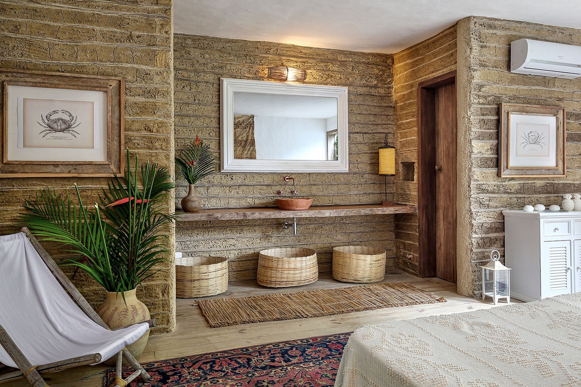 A casa transmite atmosfera que ambienta entre a praia e o campo. Assoalho de madeira. Marcos das portas em madeira. Ambientes amplos. E alguns banheiros com jardins ou janelas para ventilar.