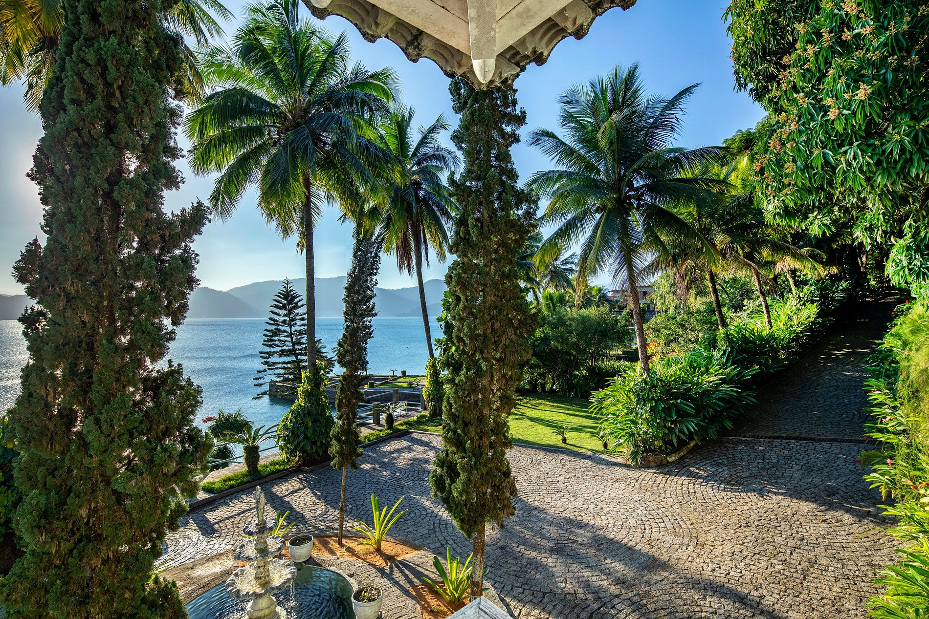 Essa magnífica propriedade estilo villa italiana possui uma linda praia privativa com 115 metros de frente, cercada de jardins, coqueiros e mata Atlântica, numa área de 12.000mts.