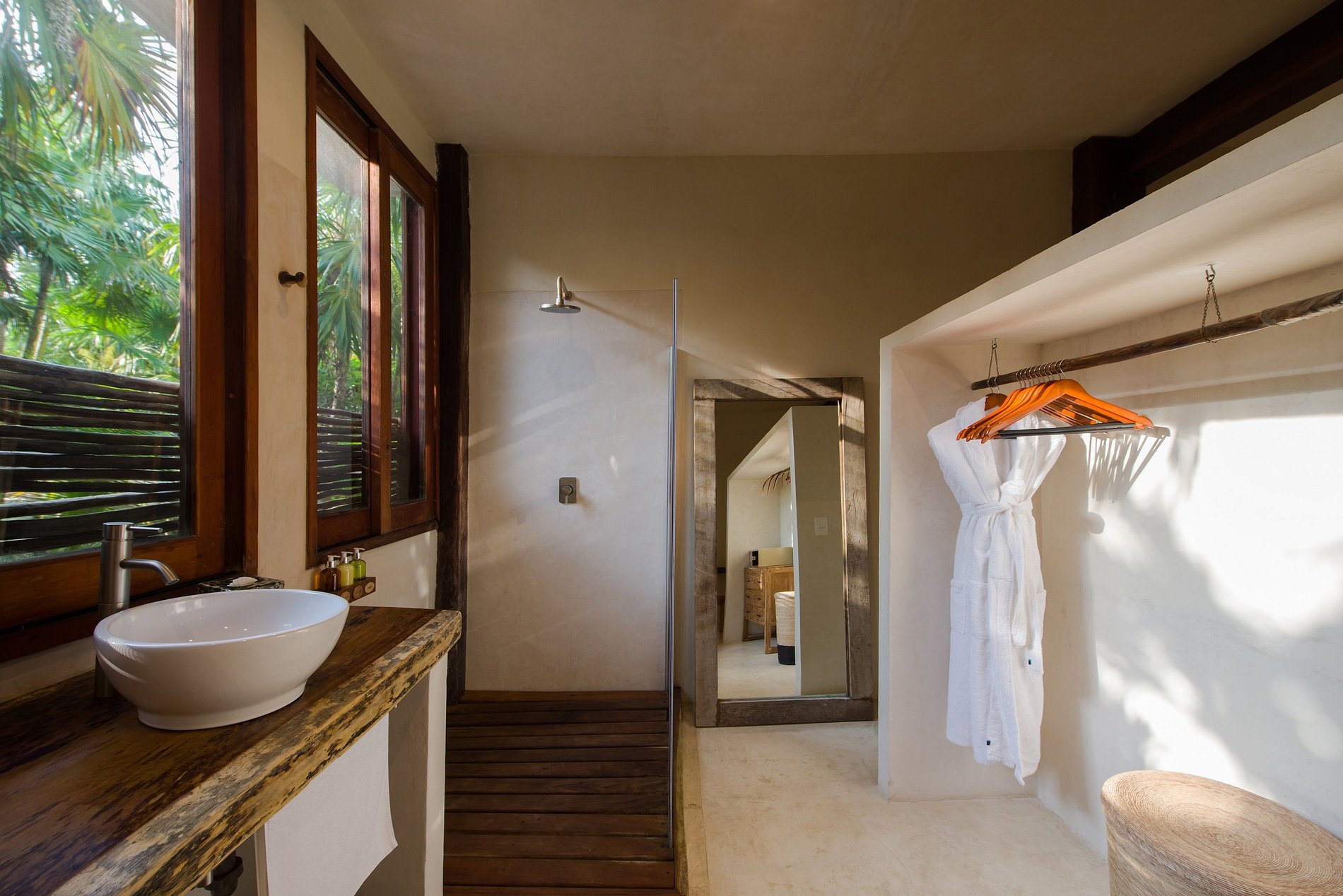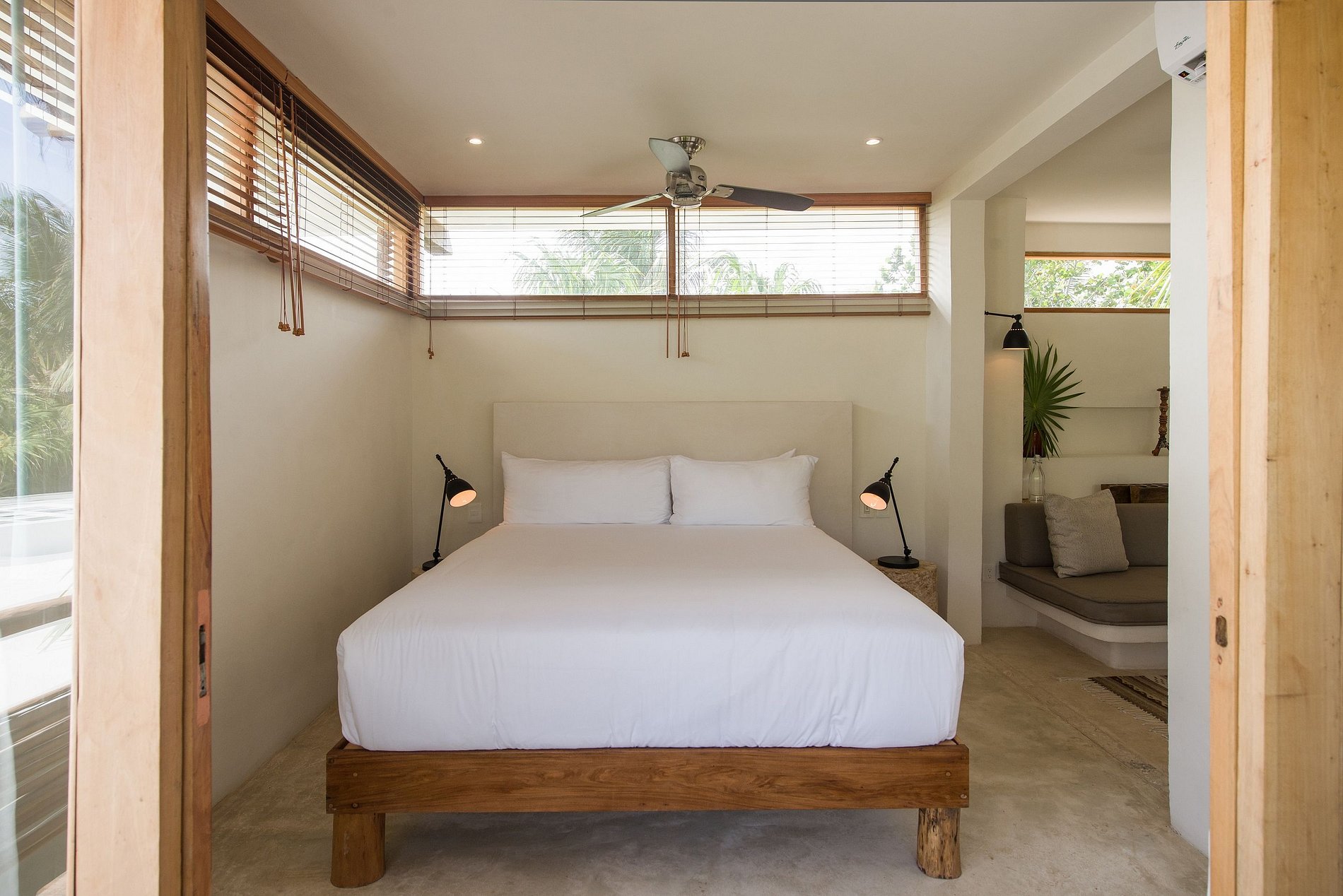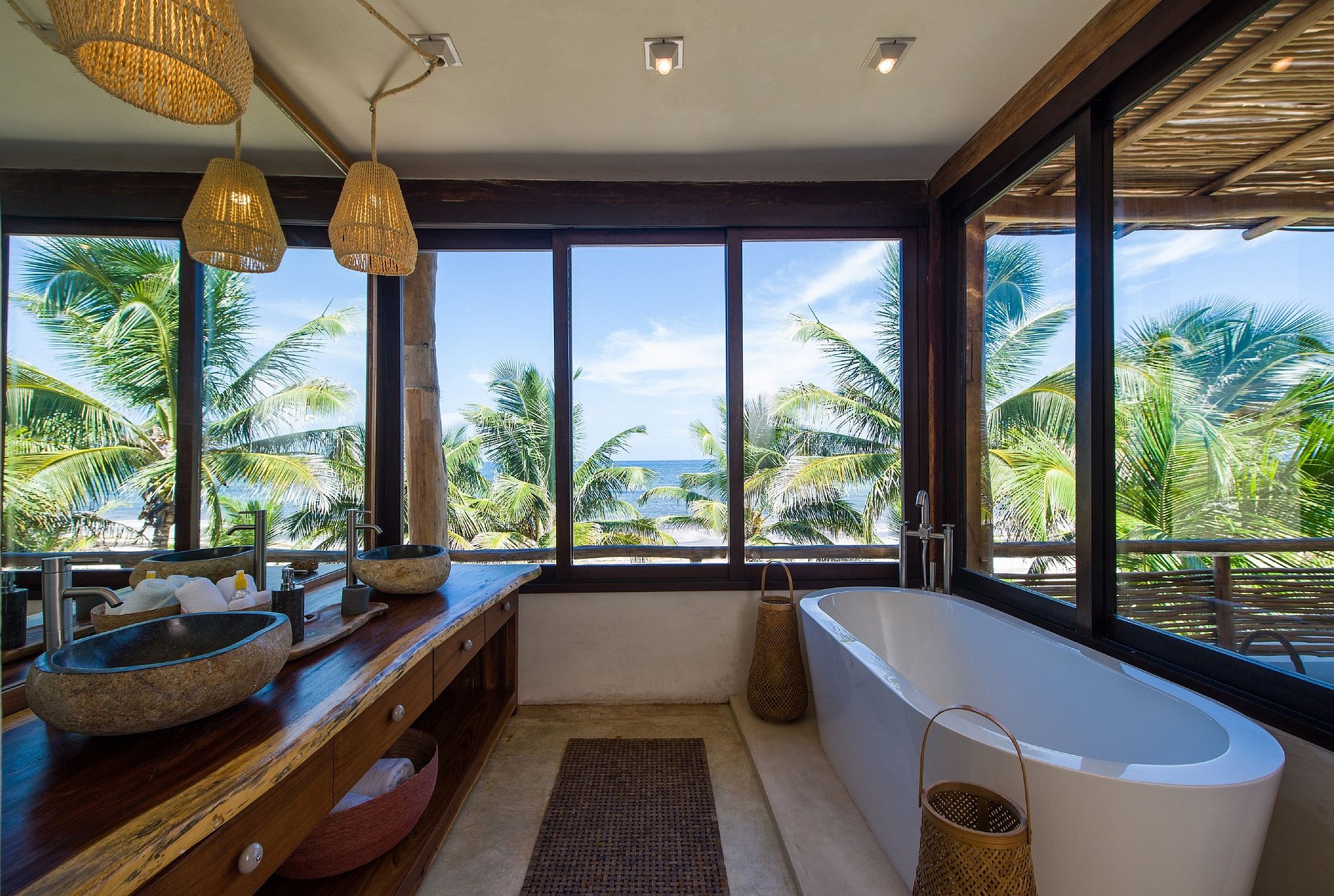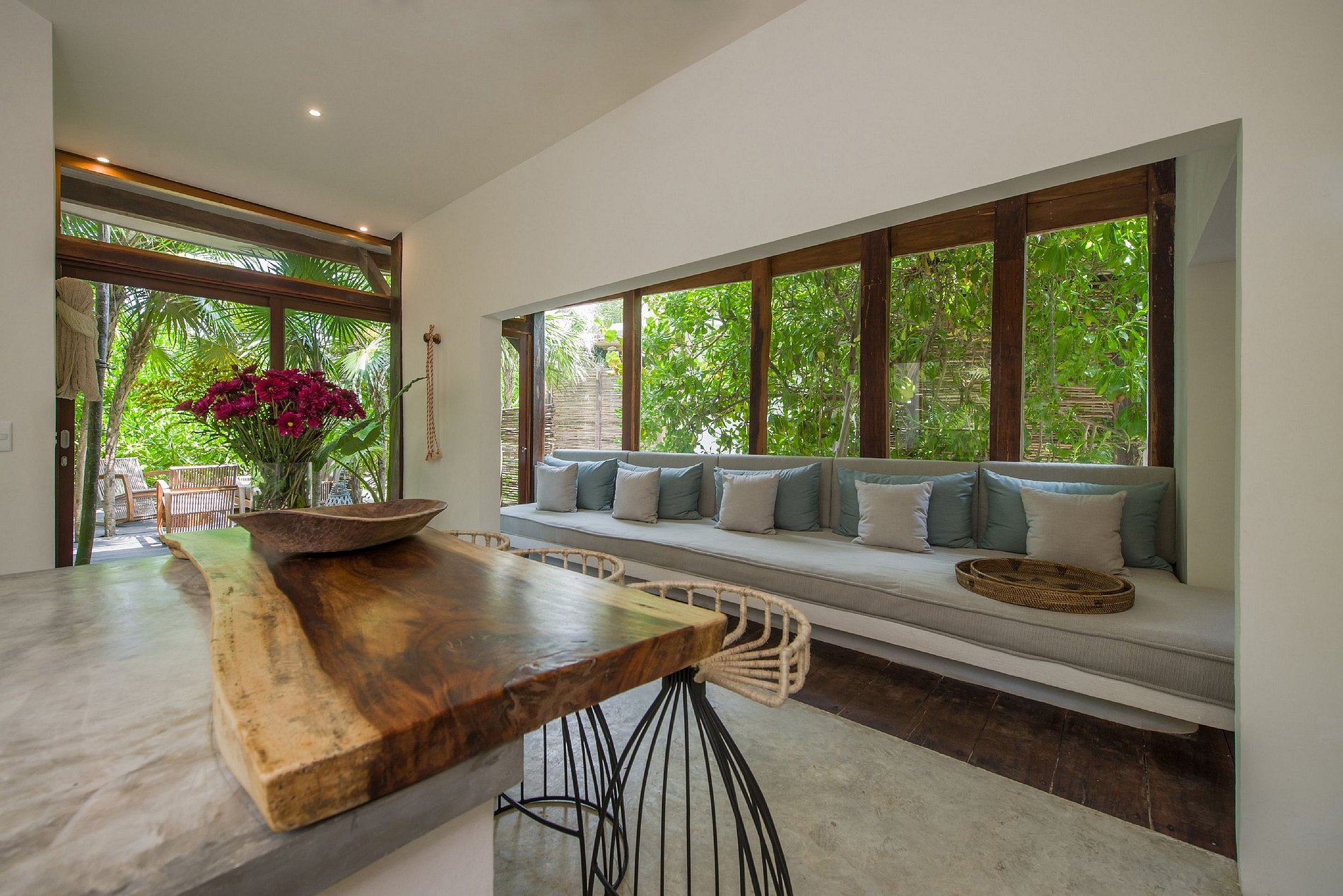 A casa também possui um bar ao ar livre e um pátio central privado com espreguiçadeiras à beira de uma piscina privada.