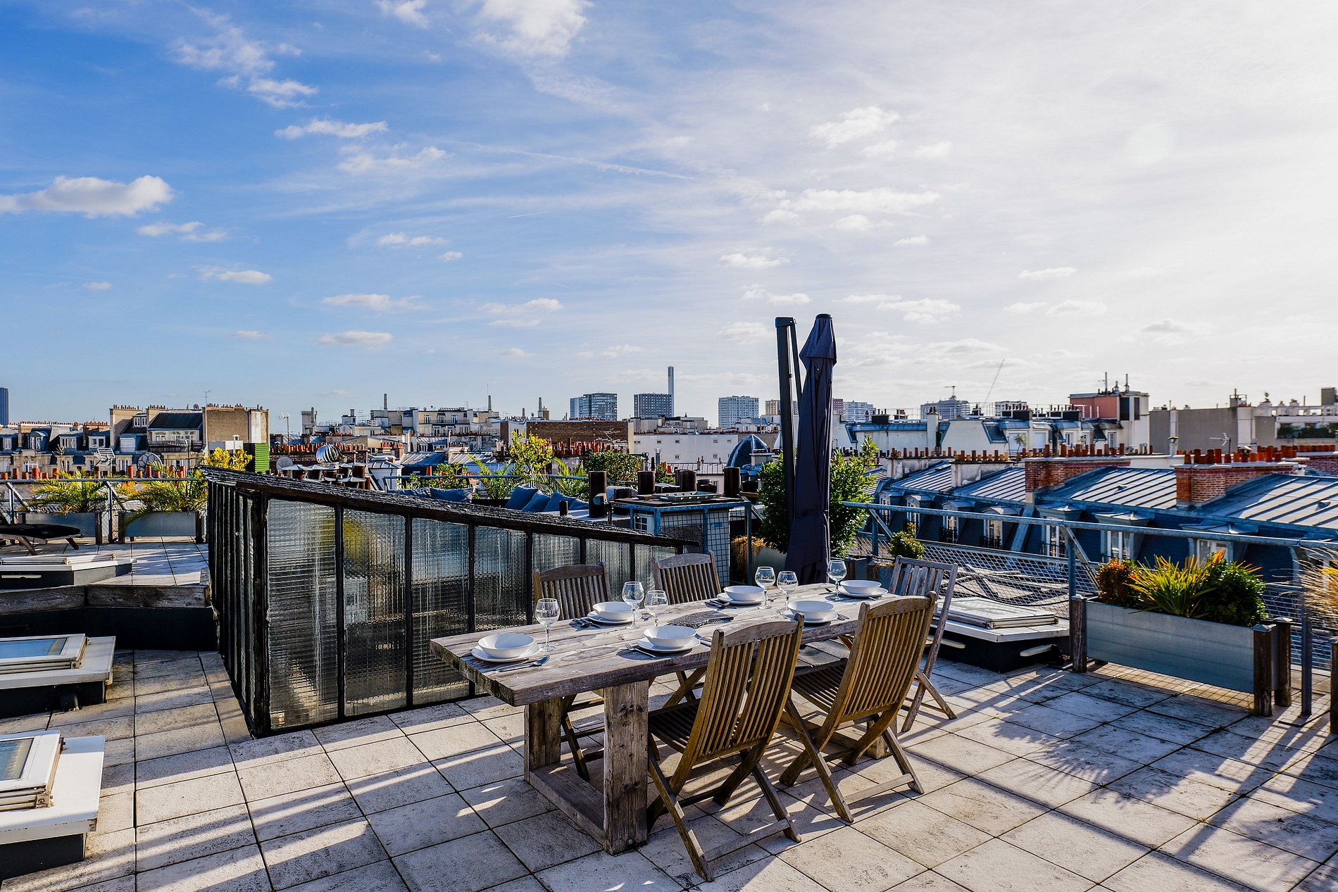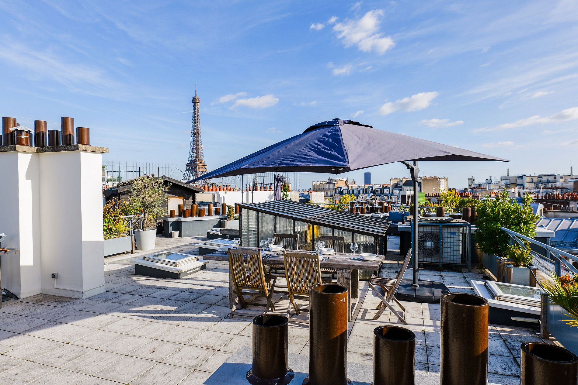 Admire a vista panorâmica do horizonte de Paris e do icônico Eiffel Tower ao sair para o amplo terraço. Seja tomando sol ou jantando à sombra do guarda-sol, o terraço oferece um cenário encantador para momentos ao ar livre e encontros inesquecíveis.