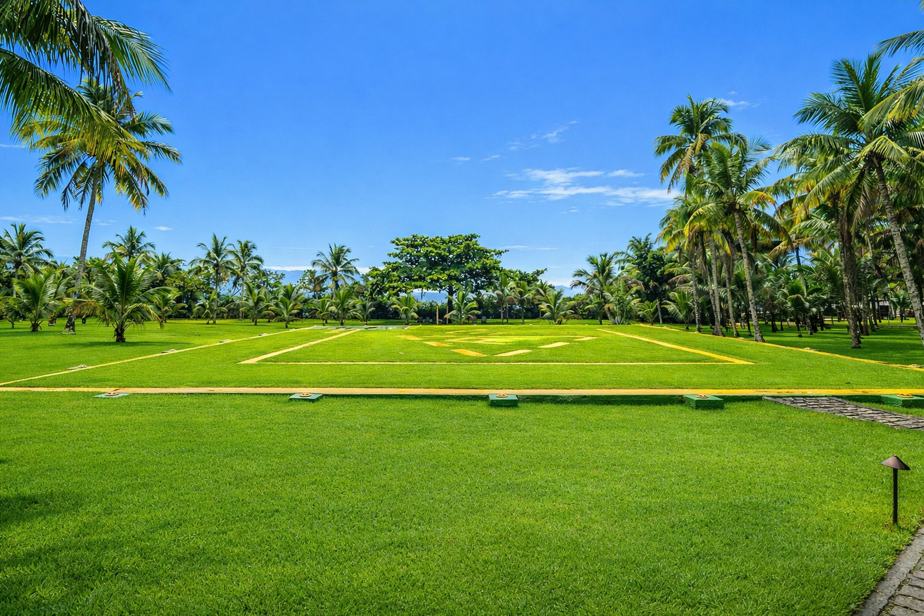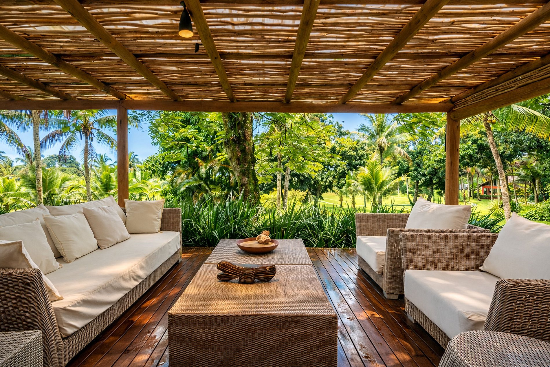 A área externa é um dos grandes destaques da propriedade. Possui praia particular de 350 metros de extensão, 23.000 m² de lindos jardins, uma maravilhosa piscina de água natural, área para churrasco, banheira de hidromassagem, parque infantil completo, equipamentos náuticos (4 caíques e 2 pranchas de standup), píer para embarcações de ate 100 pés, academia, tênis de mesa, sauna a vapor para até 21 pessoas, sinuca e heliporto homologado diurno e noturno. Uma cozinha totalmente equipada, área de jantar informal, jacuzzi, home theater e sala de estar também estão ao dispor.