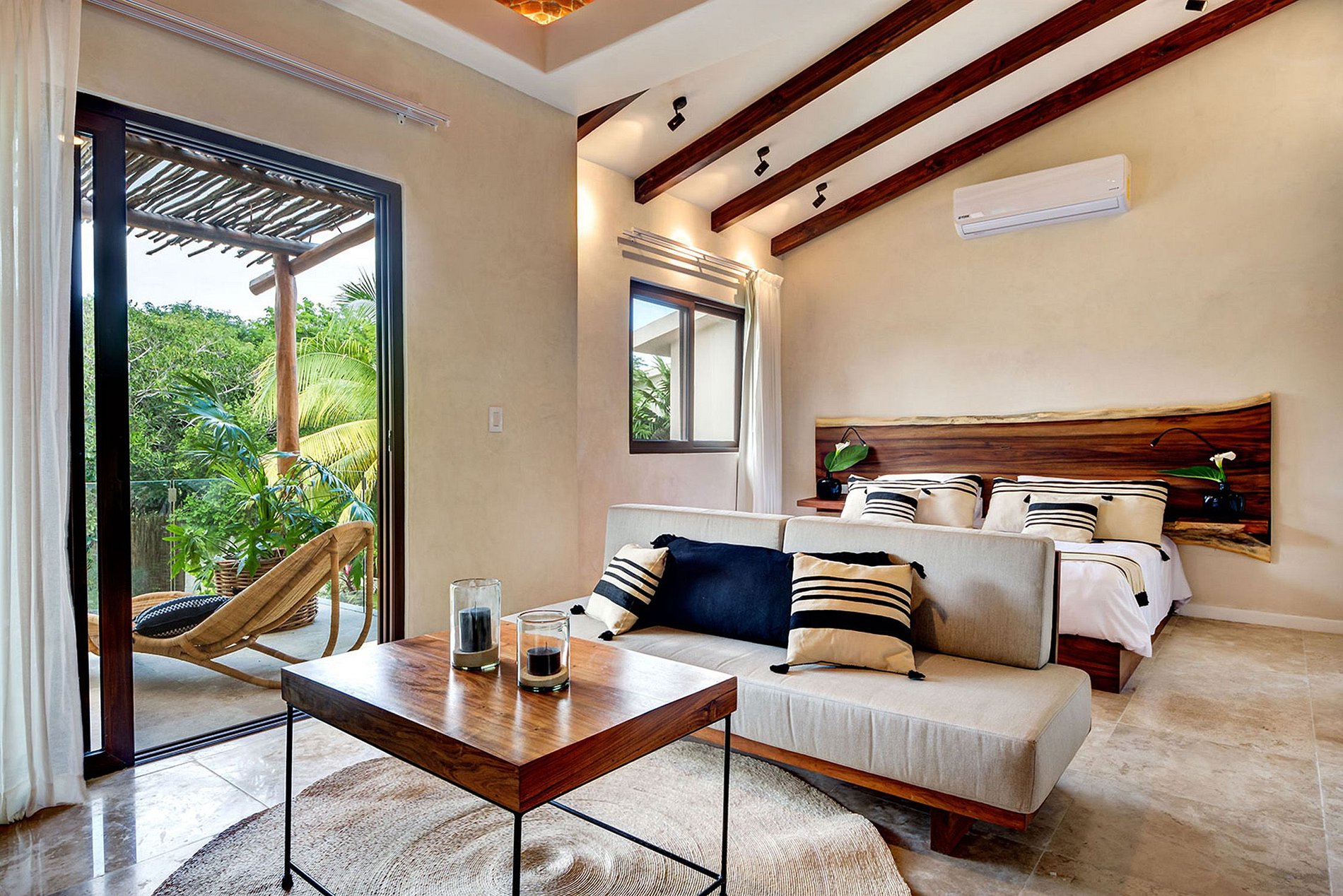 A casa orgulha-se das áreas comuns externas desta propriedade, que apresentam um terraço arejado no último andar com um bar com vista para a marina e a selva, e um espaço de palapa para atividades coletivas mais relaxantes ou coletivas, como ioga e meditação ou serviços de spa. No nível do solo, à beira da piscina, você também poderá desfrutar do sol durante o dia ou à noite, churrascos com confraternizações ao redor de uma fogueira.