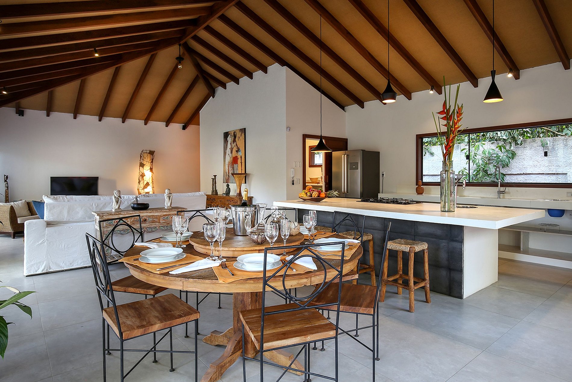 Na sala o sofá de linho reclinável de 3m de largura. Smart TV 60 "na área social com emparelhamento direto com Android ou IOS. Mesa de madeira de demolição redonda (Peroba) com centro giratório e 8 lugares.