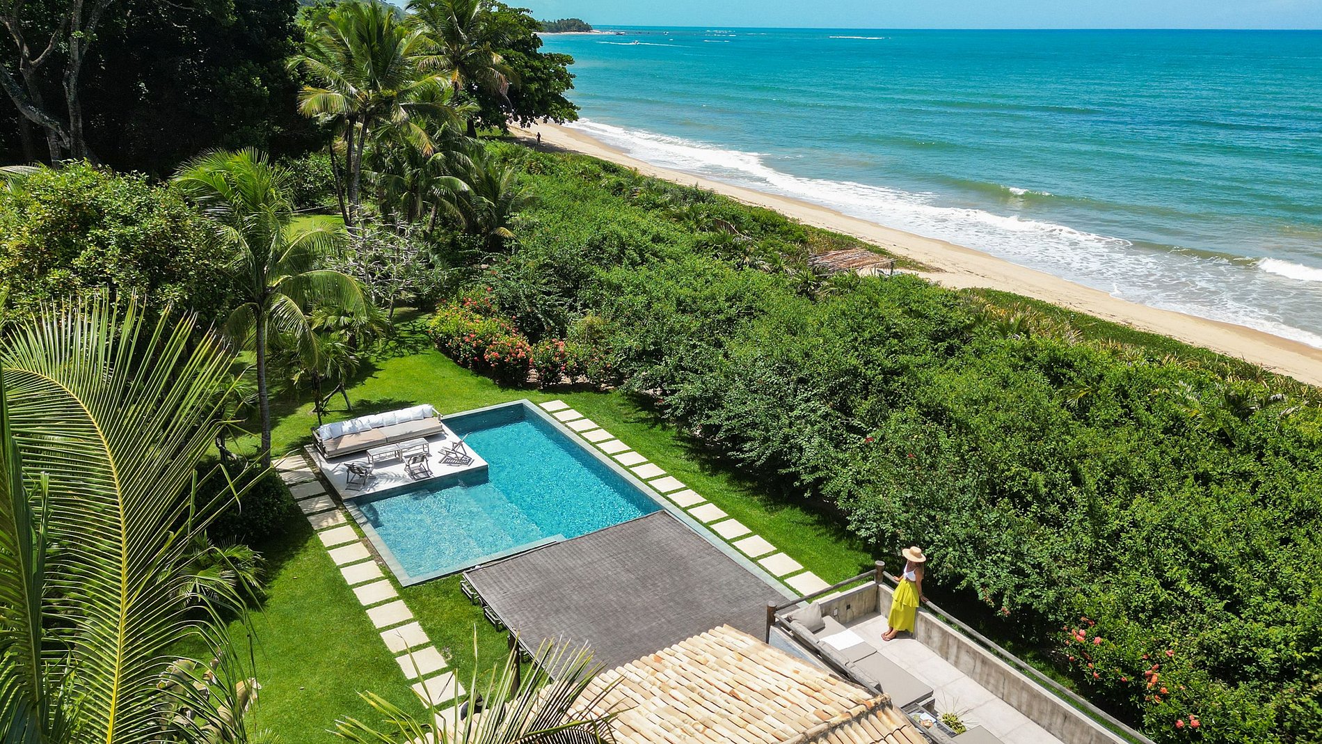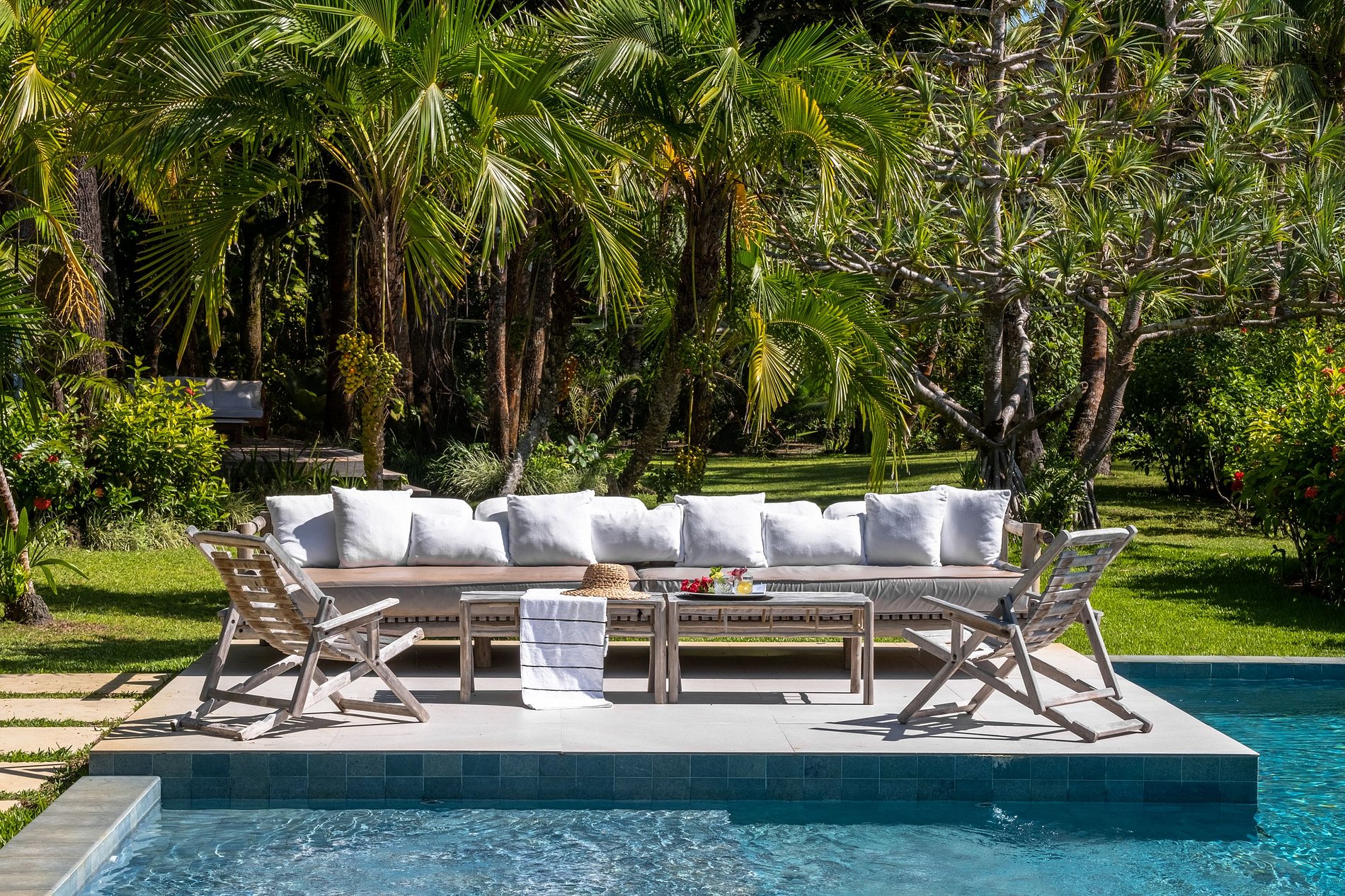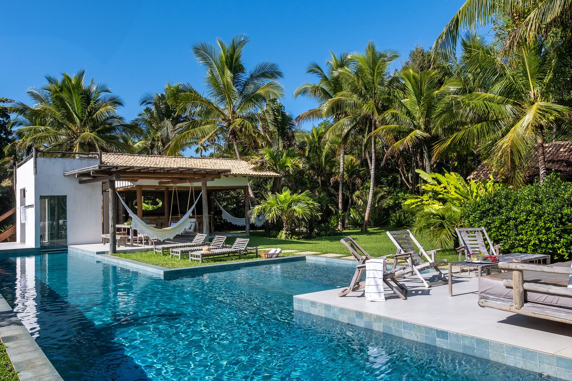A bela piscina nova e suas áreas de descanso, sua área gourmet coberta e sua sauna com vista e acesso direto a água morna oferecem um espaço privilegiado, a poucos passos da casa e da praia.