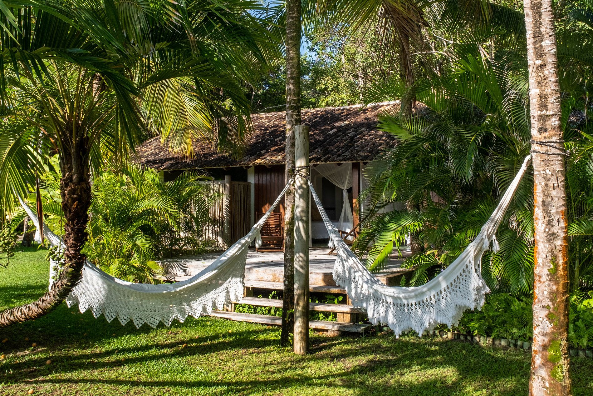 Suíte 2: cama queen, mosqueteiro, ar condicionado, varanda, vista para o jardim. Suíte 3: cama queen, mosqueteiro, ar condicionado, varanda, vista para o jardim.