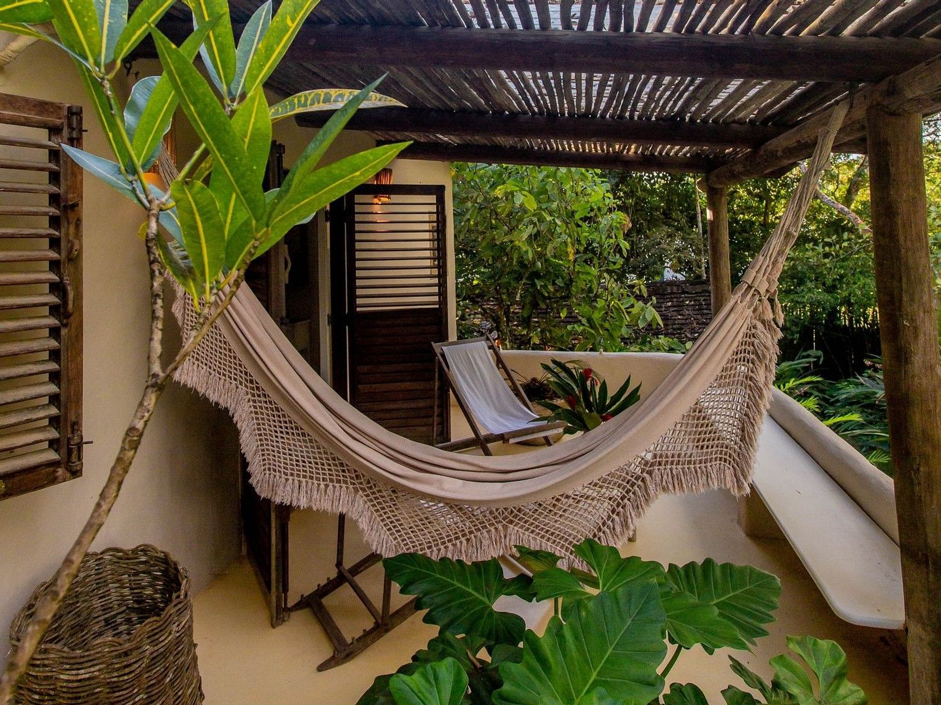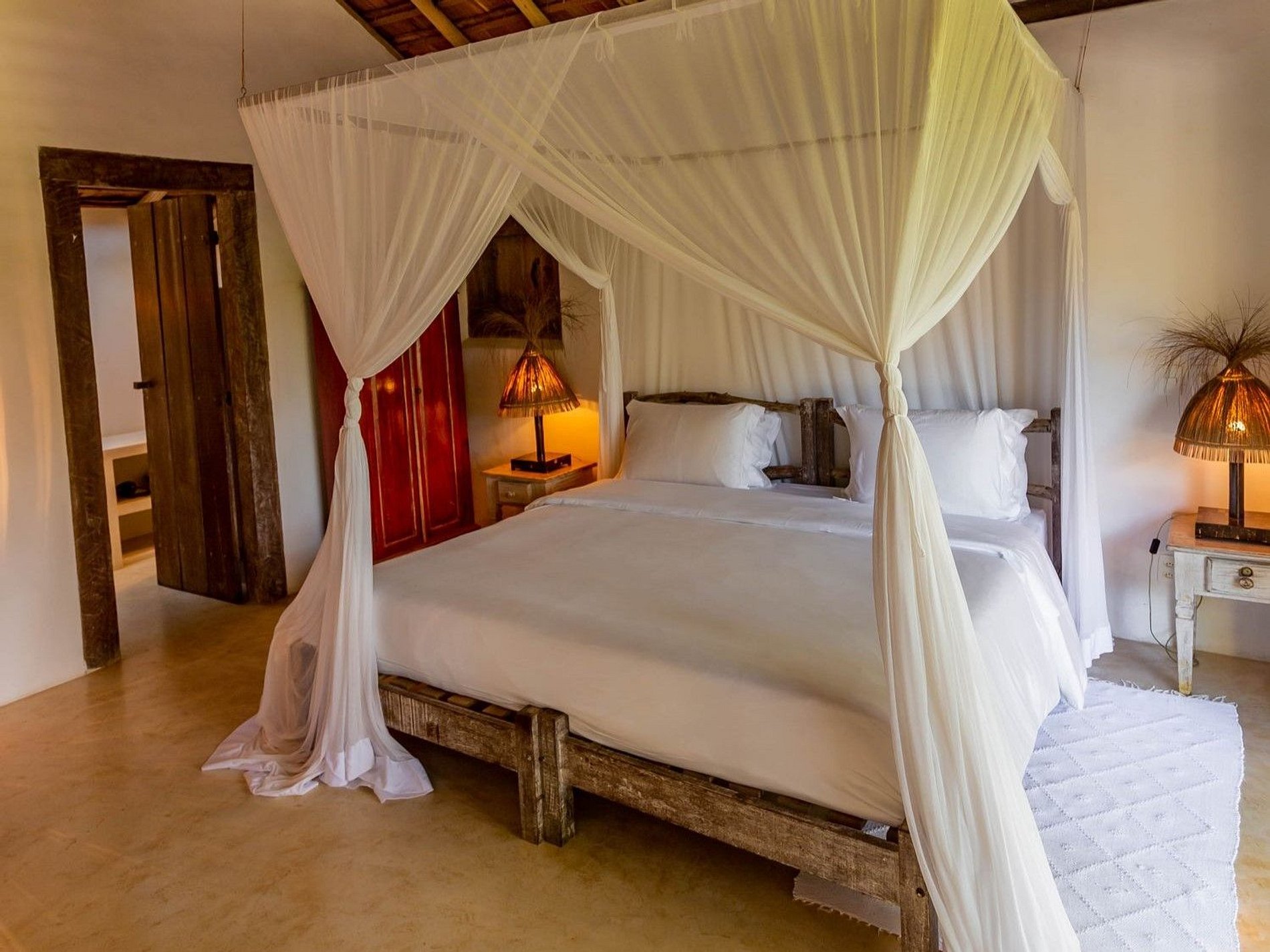 A propriedade, de design rústico e decoração acolhedora, conta com espaços abertos, integrados à natureza, arejados e frescos. Duas suítes na casa principal, sendo uma no andar superior com uma charmosa varanda com vista para o jardim e o mar no horizonte. Atravessando o jardim, mais duas amplas e independentes suítes, garantindo conforto e privacidade para todos os hóspedes.