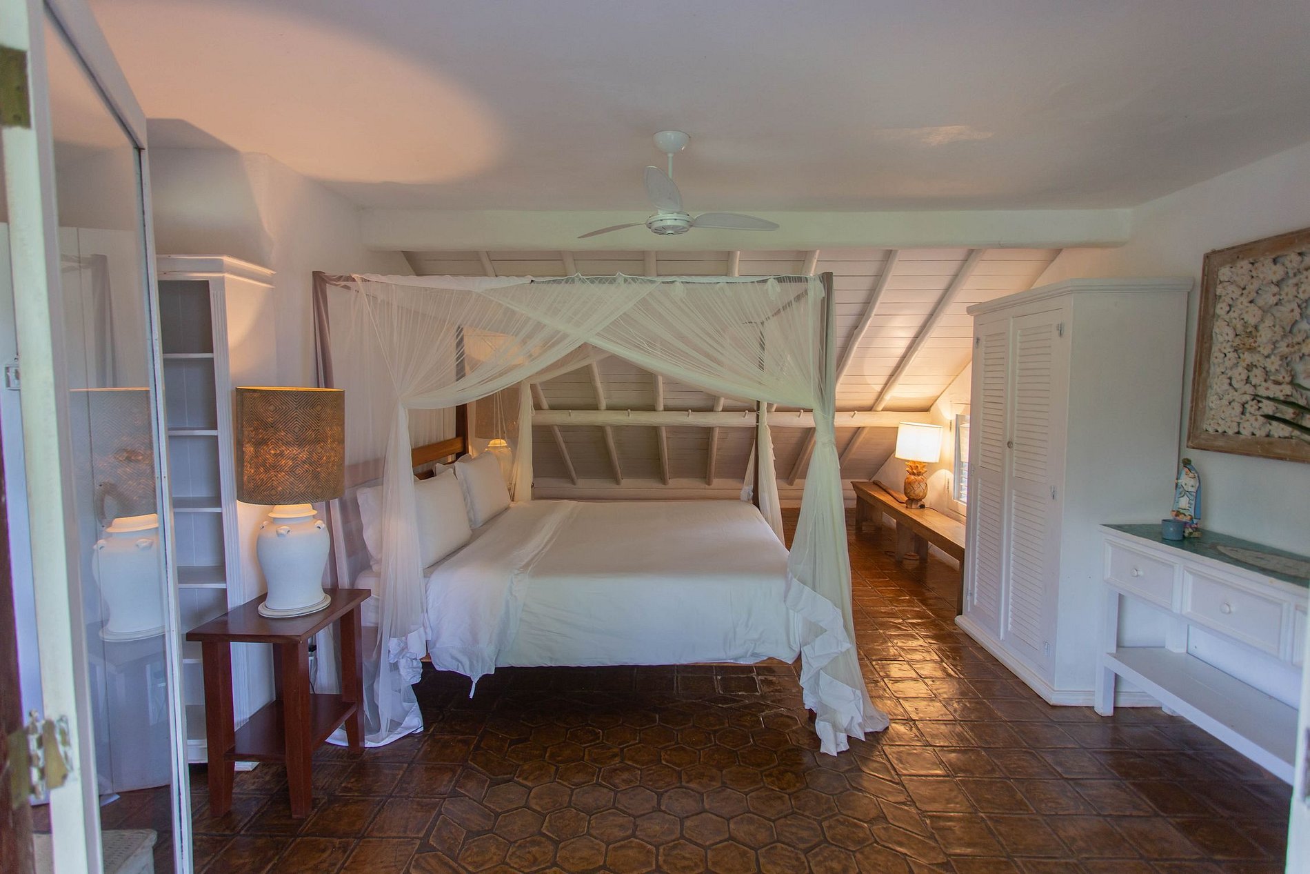 A propriedade, de design rústico e decoração acolhedora, conta com espaços abertos, integrados à natureza, arejados e frescos. Duas suítes na casa principal, sendo uma no andar superior com uma charmosa varanda com vista para o jardim e o mar no horizonte. Atravessando o jardim, mais duas amplas e independentes suítes, garantindo conforto e privacidade para todos os hóspedes.