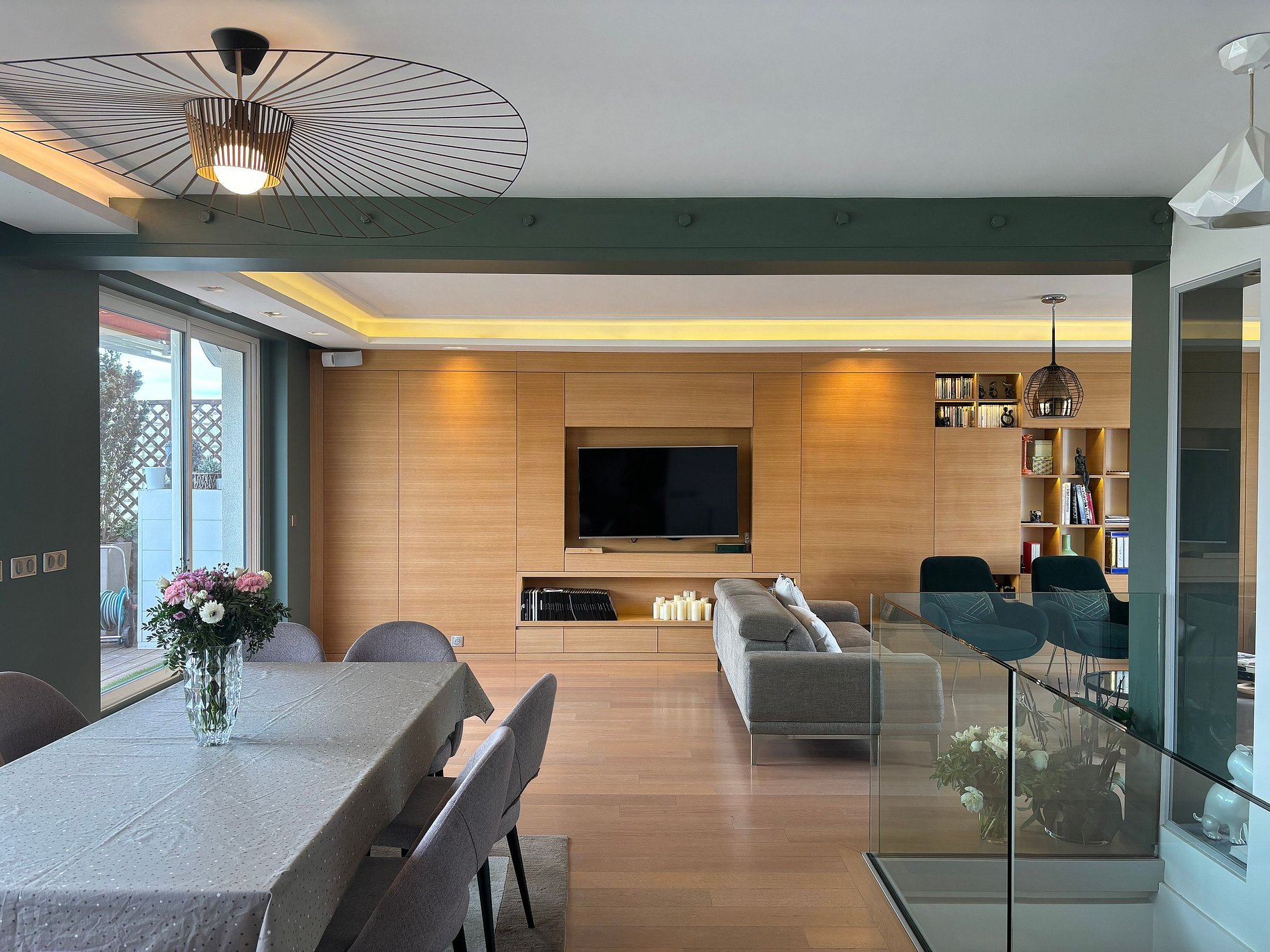 Totalmente climatizada para conforto ideal, a cobertura possui amplas áreas de estar, incluindo uma sala de estar espaçosa, uma sala de jantar e uma cozinha aberta totalmente equipada. As áreas de estar se abrem para dois terraços que oferecem vistas deslumbrantes do horizonte de Paris, perfeitos para relaxar ou receber convidados.