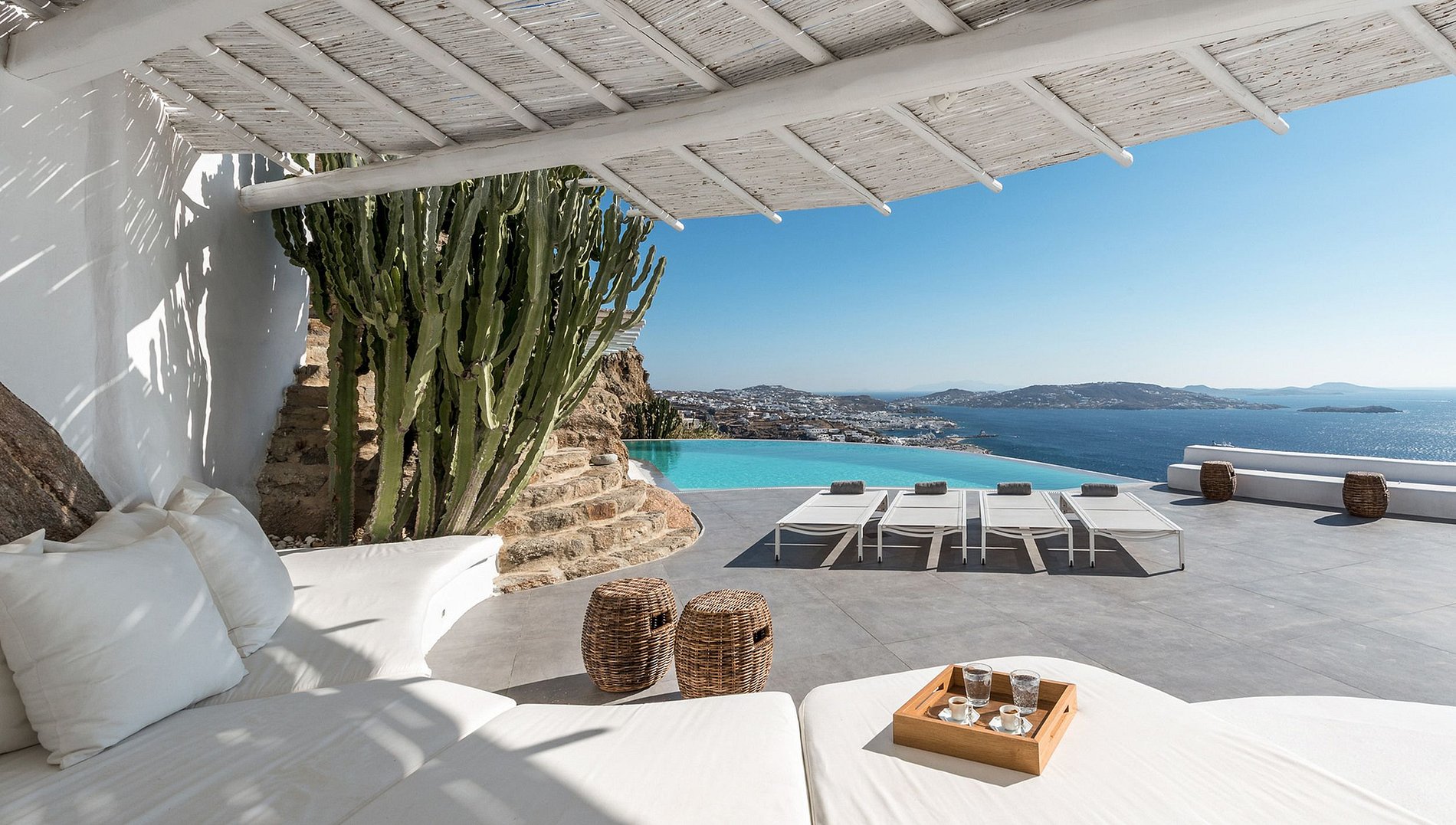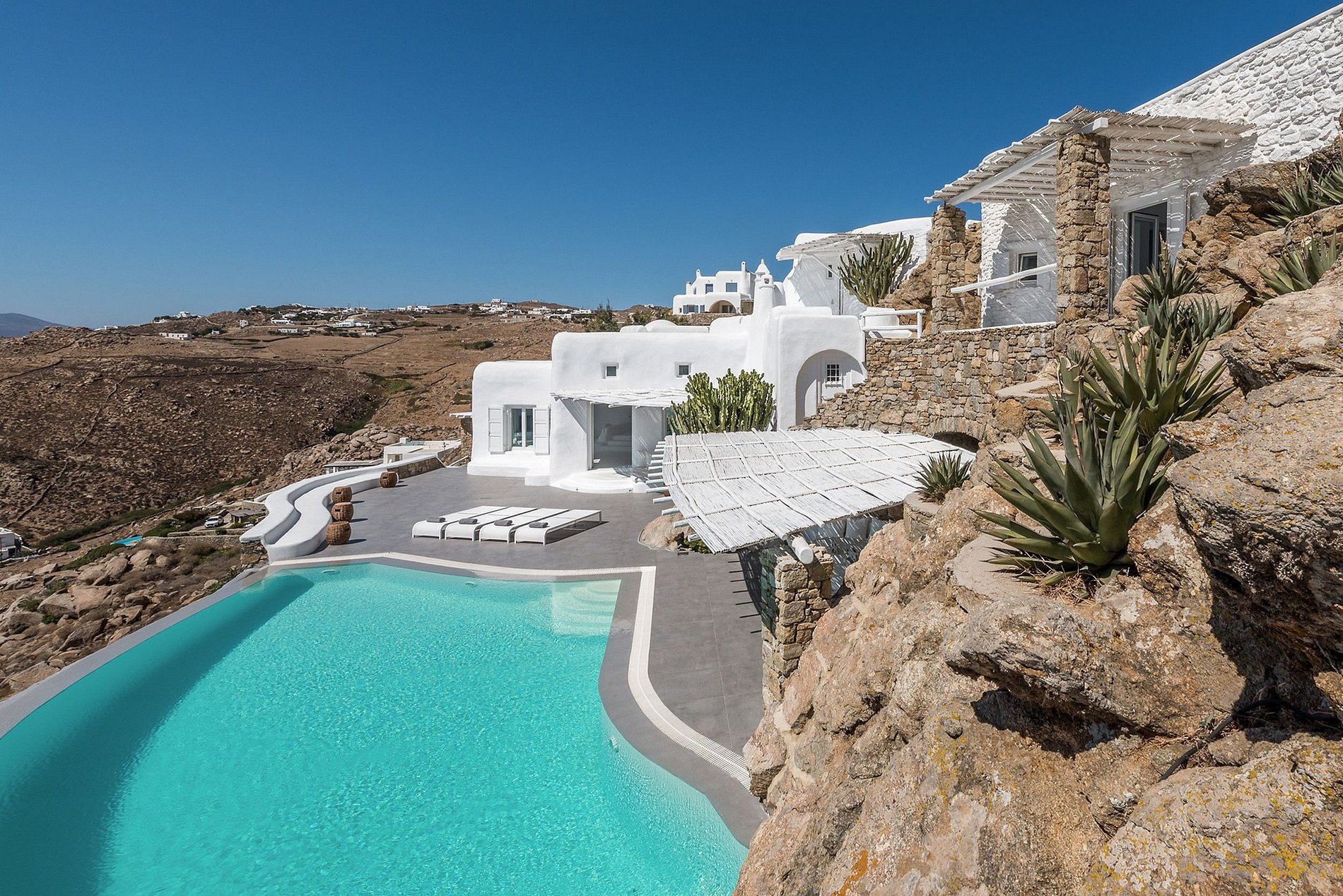 A villa está situada na área de Agia Sofia, com vista para o Mar Egeu, convenientemente perto da cidade de Mykonos e do novo porto. Pode acomodar até 10 pessoas em seus 5 quartos duplos com banheiro privativo. A cor branca domina o interior de design tradicional com sofás e camas embutidos, enquanto a área externa apresenta uma piscina infinita e um magnífico lounge com bar no nível superior, com vista deslumbrante do mar no pôr do sol e de Chora.