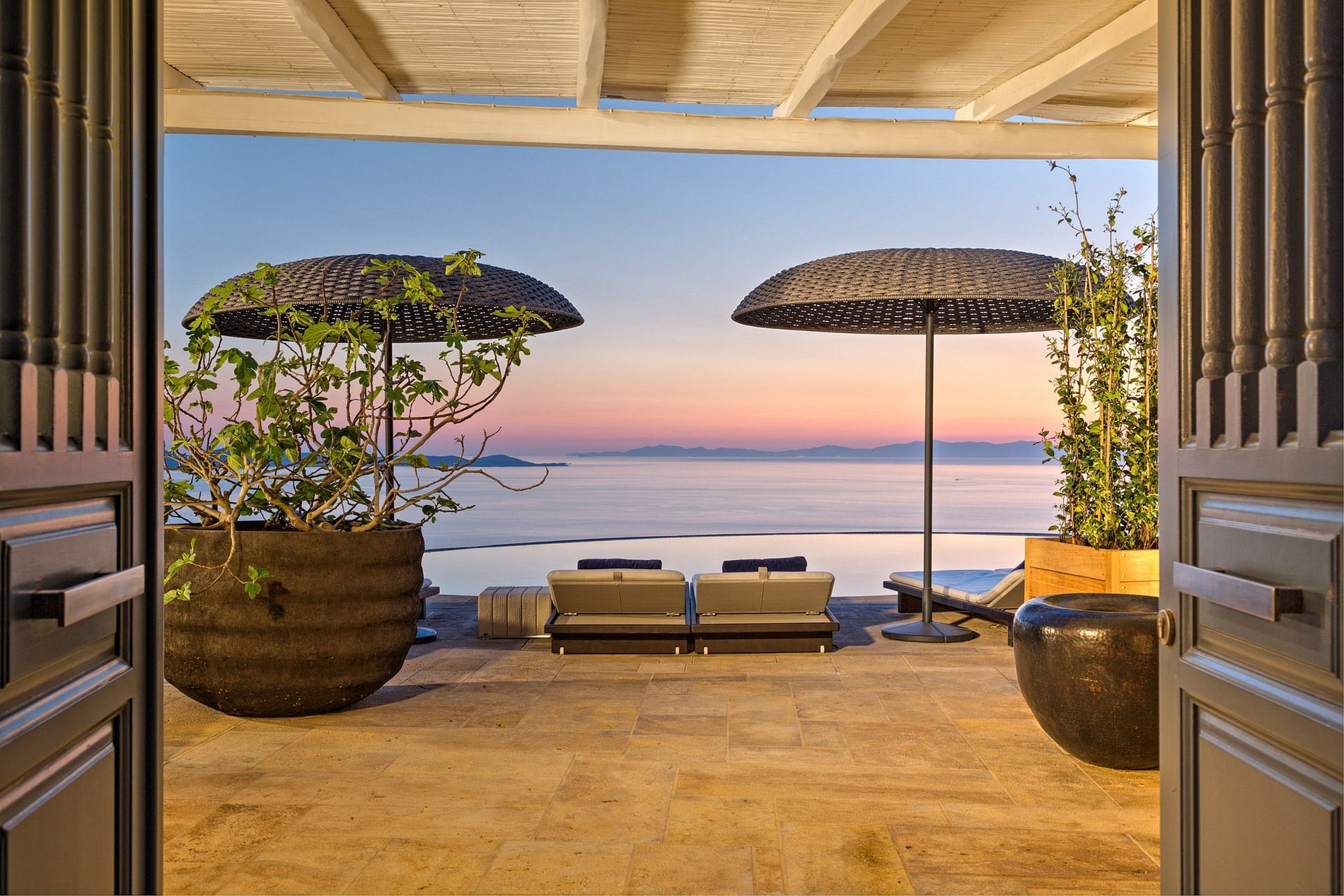 Esta propriedade majestosa, situada na área nobre de Agia Sofia e com vista para o Mar Egeu, está convenientemente perto da cidade de Mykonos e do novo porto. É composto por 8 quartos com banheiro privativo e um quarto de empregada. O interior elegante, com móveis exclusivos e excepcionalmente sofisticados, está lindamente decorado em tons de terra aconchegantes e com detalhes em madeira. A propriedade também inclui uma unidade de banho turco, uma área de academia, uma capela pitoresca e uma cozinha do chef. A área externa: uma piscina infinita com espetaculares vistas panorâmicas do pôr do sol.