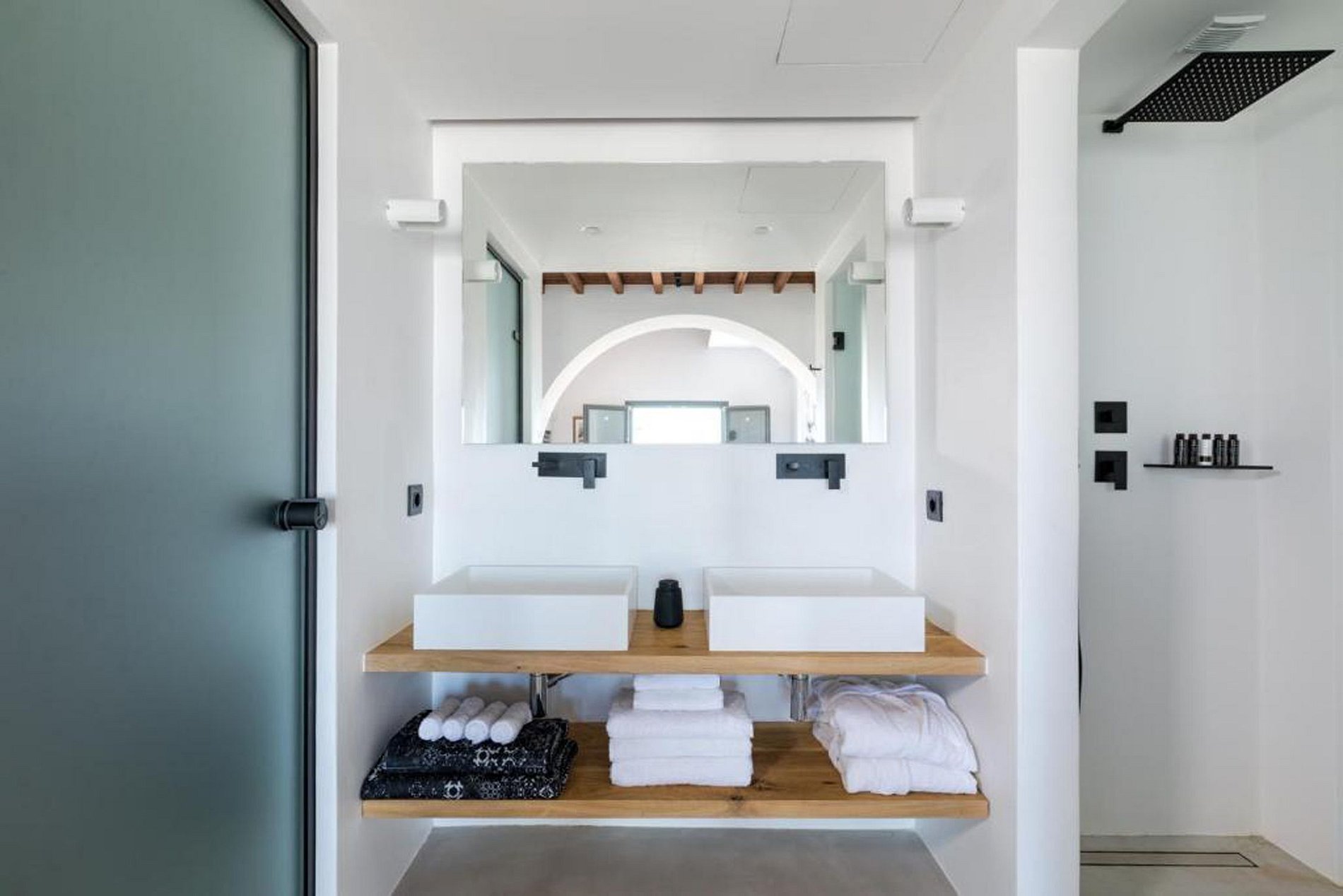 A primeira unidade de aproximadamente 115m² é composta por 3 quartos, sala de estar com sofá e cozinha. O terraço da sala de estar leva a um lounge externo com uma rede e uma piscina privativa com vistas extraordinárias de Mykonos.