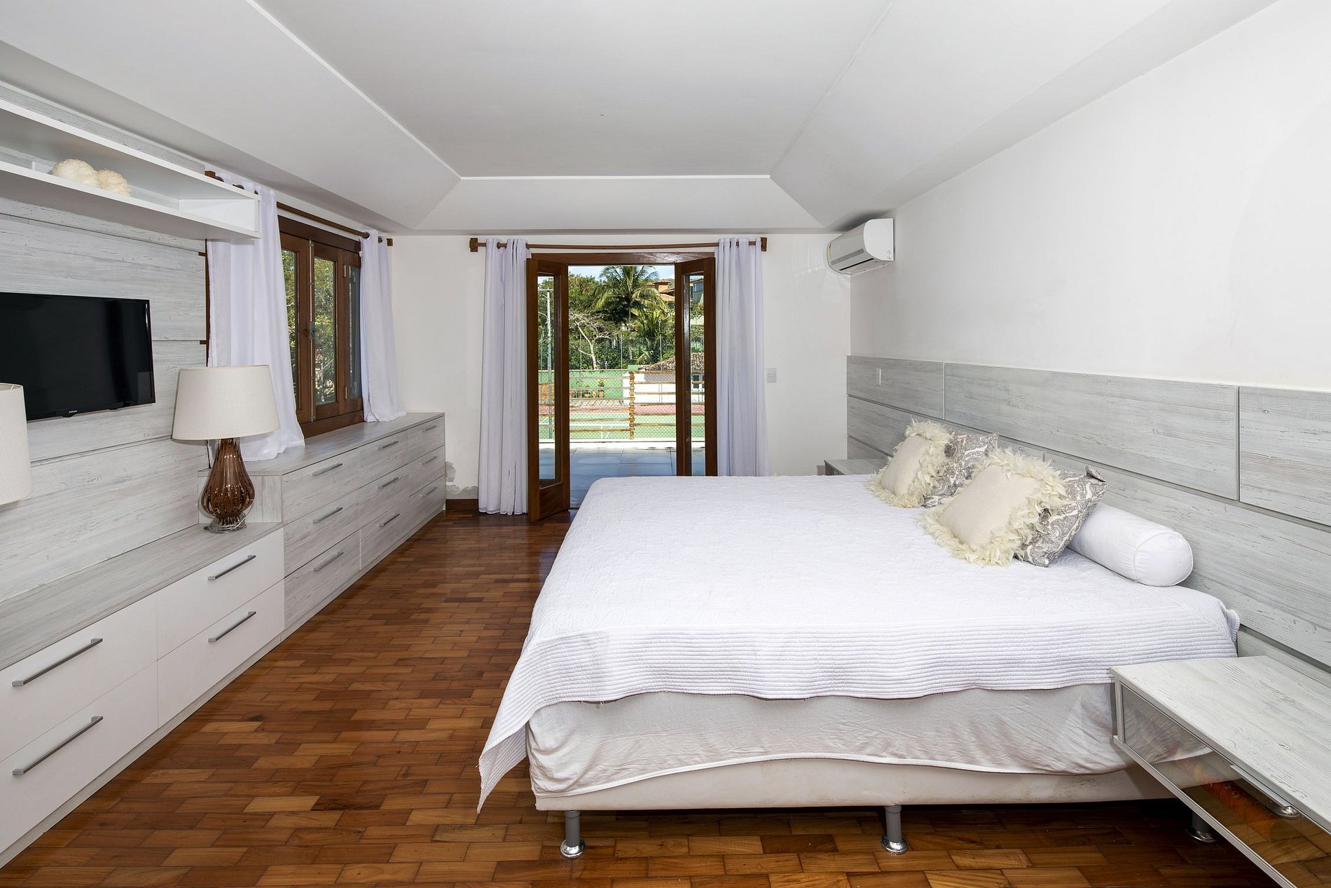 São dois andares que acomodam até 16 pessoas em suas 8 suítes completas e confortáveis, com camas, móveis e tecidos de alta qualidade e vista para o exterior a partir das janelas ou portas de vidro deslizantes.
