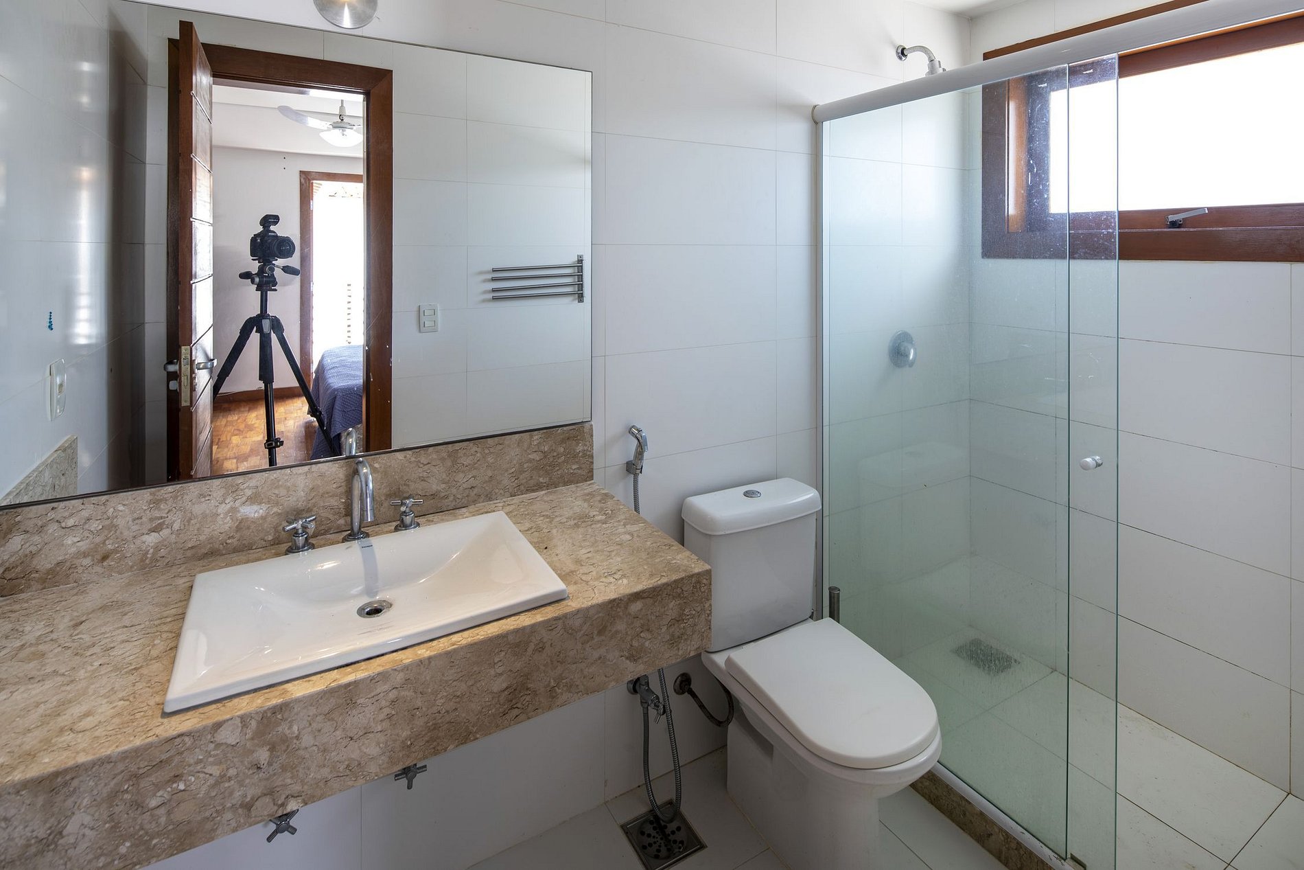 Do lado de fora você terá um quintal completamente pavimentado e dividido com um extenso deck em madeira, que cerca a belíssima e refrescante piscina de azuleiro azul. Deitar-se nas largas aconchegantes espreguiçadeiras é um passatempo relaxante para se fazer enquanto aprecia um bom drink ou recebe um bom bronzeado.