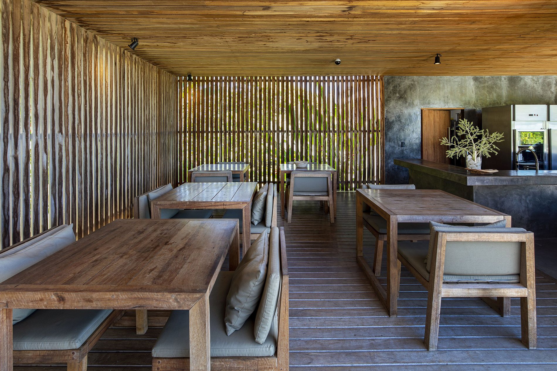A enorme e luminosa sala de estar com móveis de madeira projetados apenas para a vila, o grande deck da piscina de madeira e a longa cozinha americana estão abertas na piscina de sedução e no amplo campo verde que se espalha até uma praia particular de areia branca.