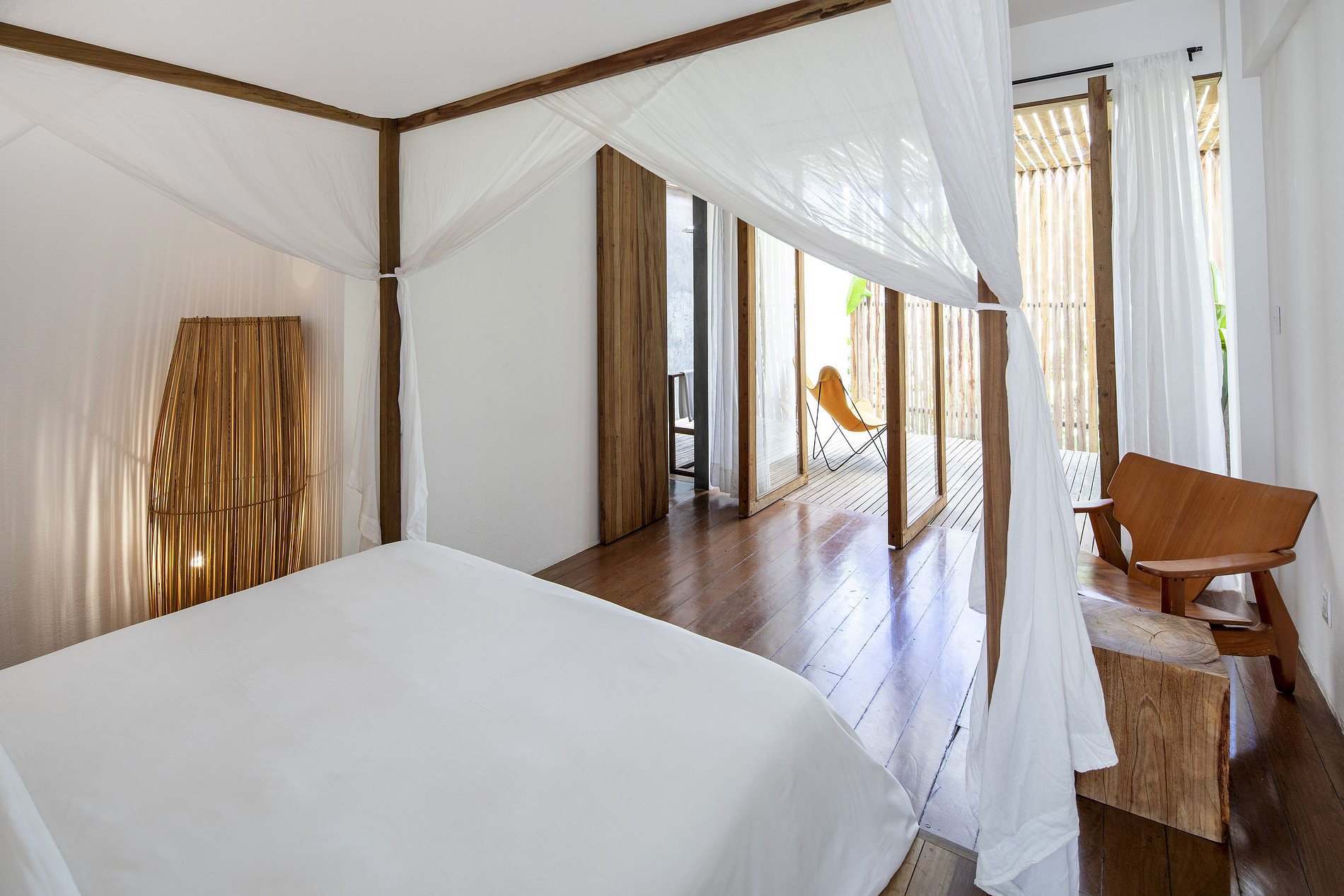 Suíte 2: cama king size, rede mosquiteira, ar-condicionado, cofre, acesso ao deck da piscina, varanda com piscina e vista para o mar