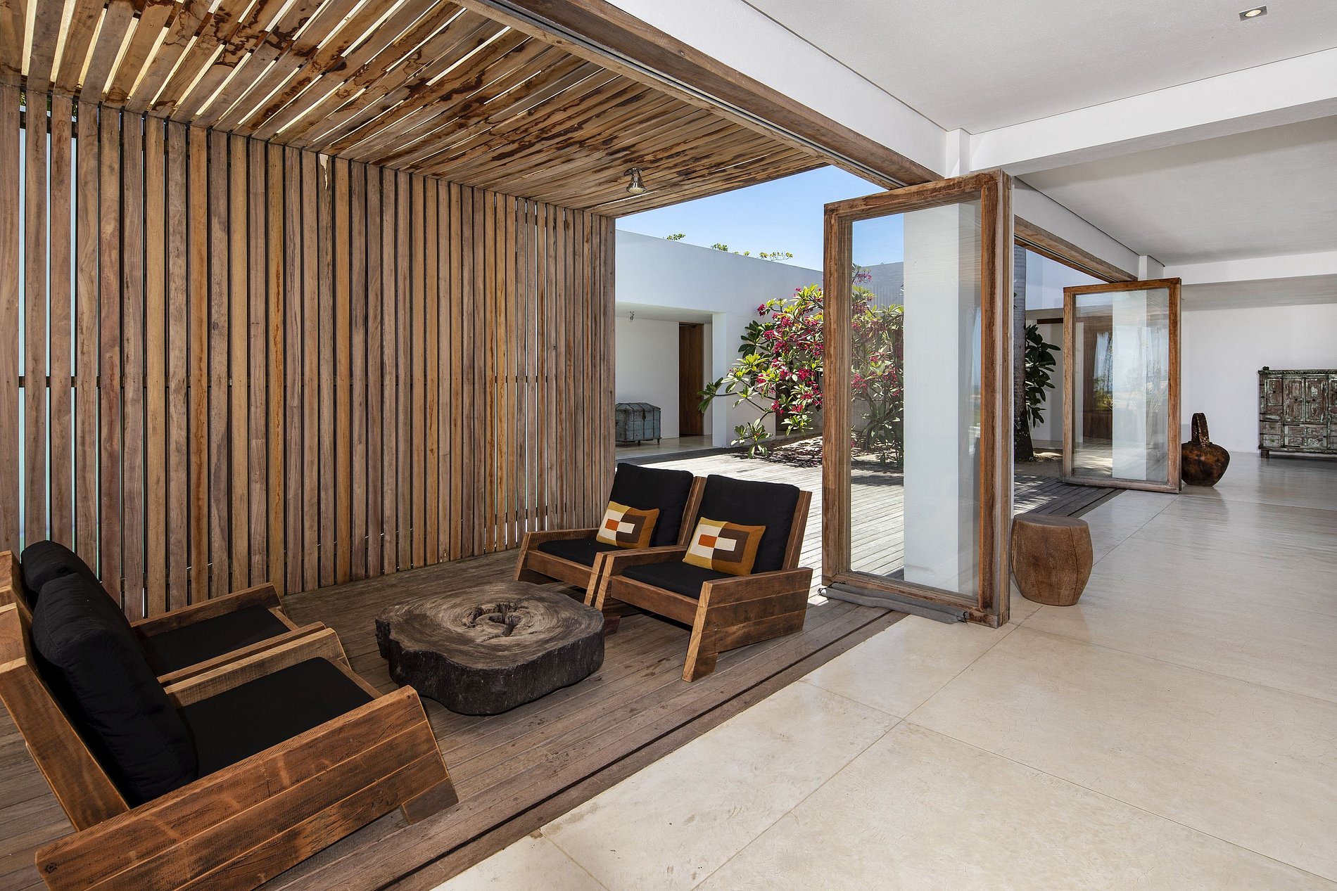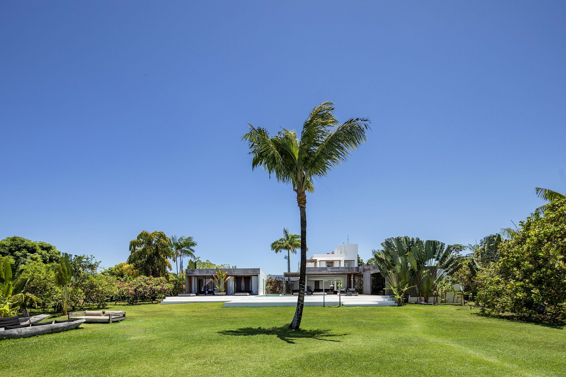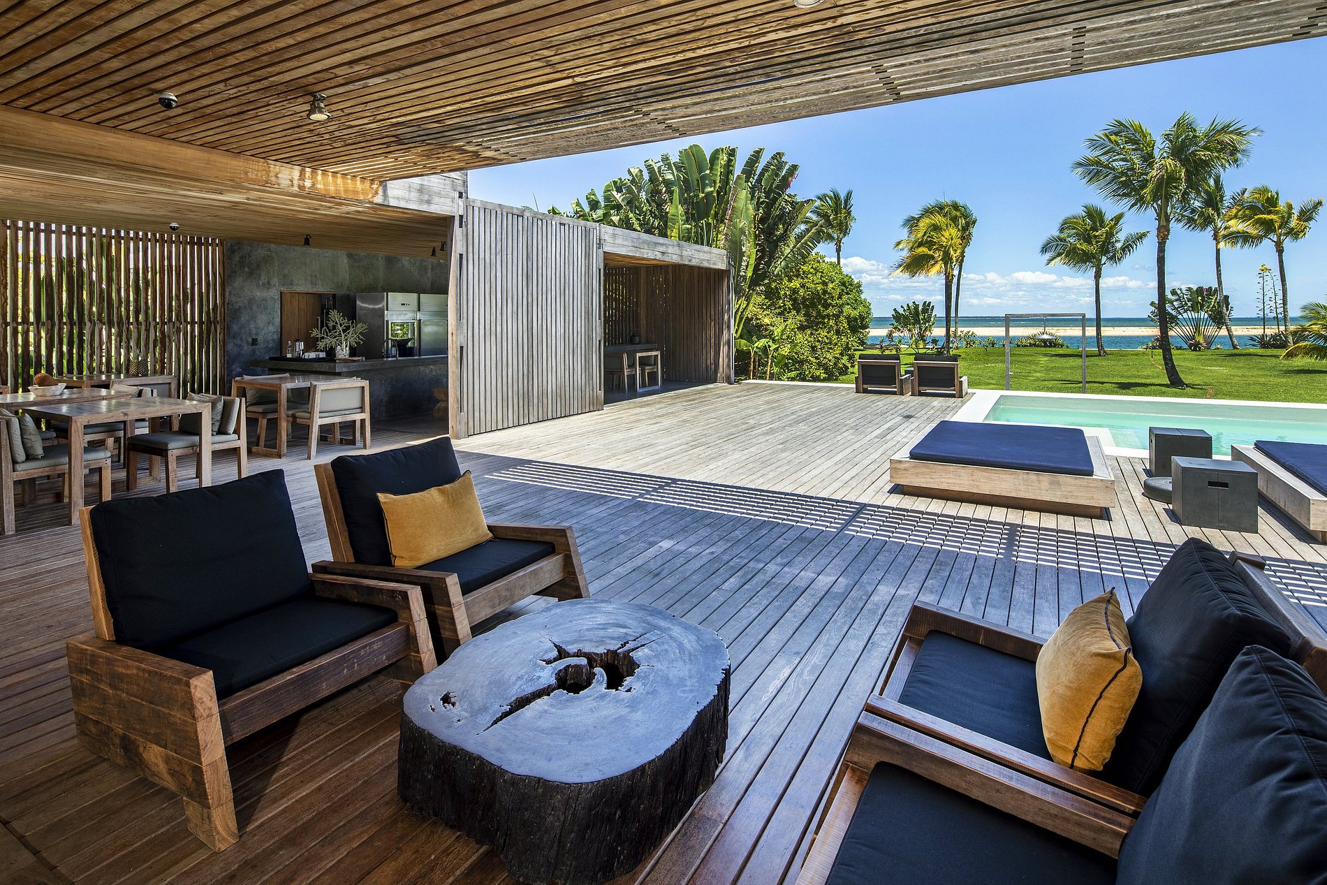 A enorme e luminosa sala de estar com móveis de madeira projetados apenas para a vila, o grande deck da piscina de madeira e a longa cozinha americana estão abertas na piscina de sedução e no amplo campo verde que se espalha até uma praia particular de areia branca.