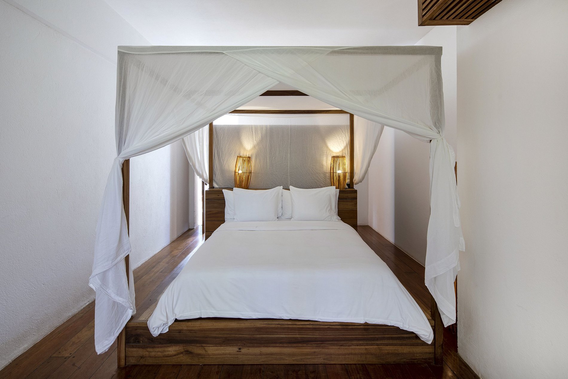 Suíte 2: cama king size, rede mosquiteira, ar-condicionado, cofre, acesso ao deck da piscina, varanda com piscina e vista para o mar