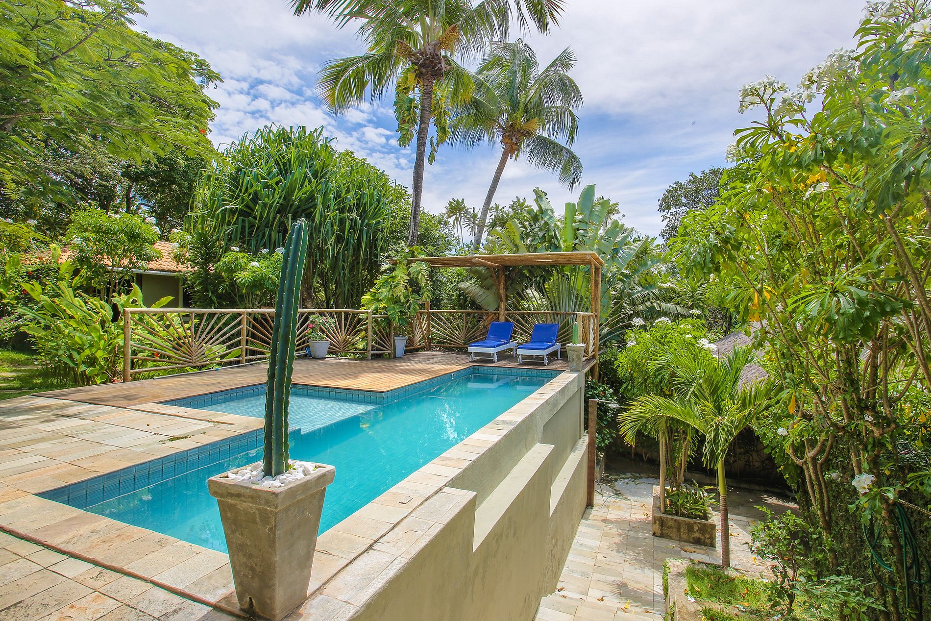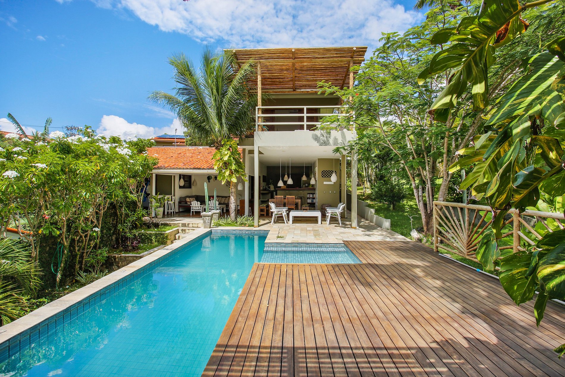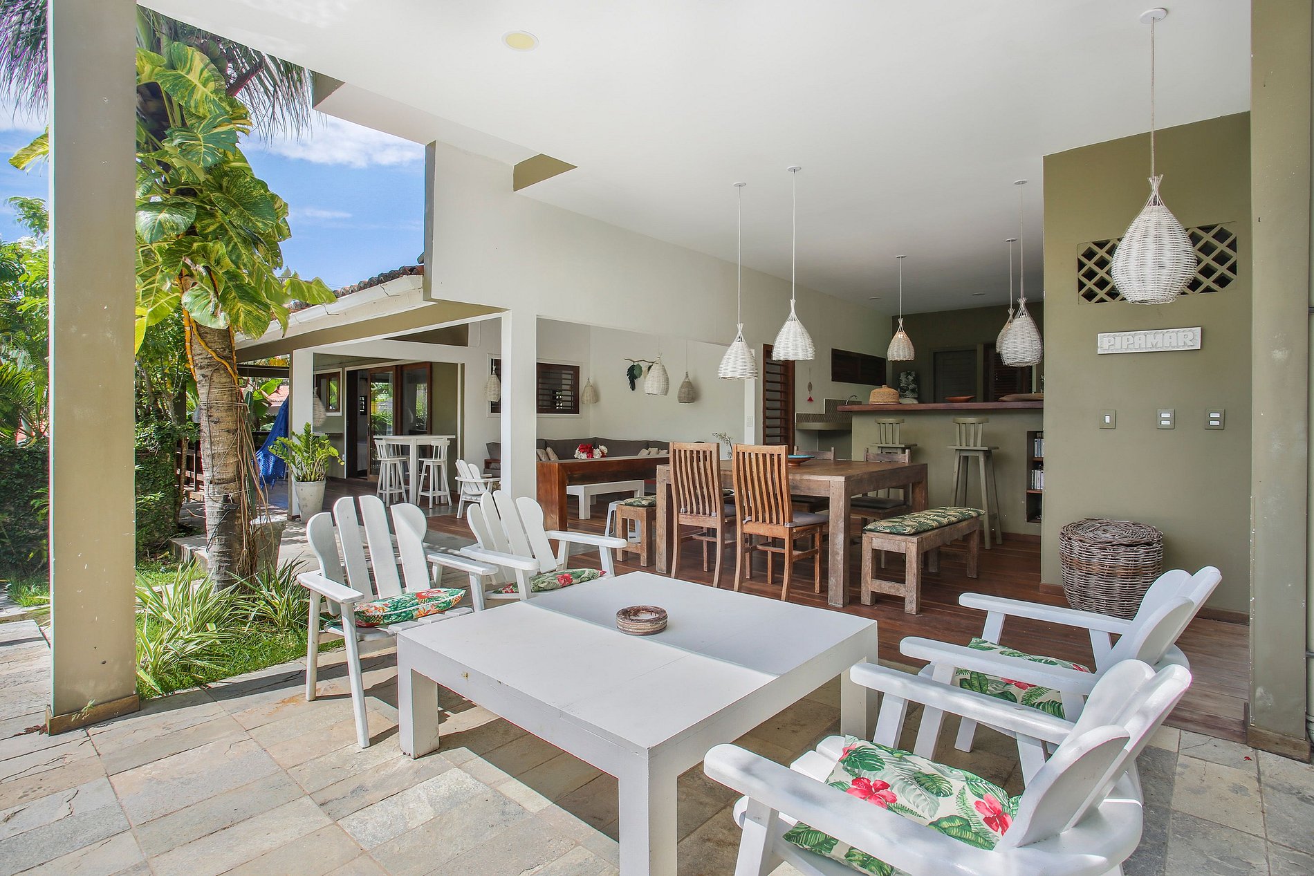 A área externa é um dos grandes destaques da propriedade. A casa conta com uma linda piscina privativa com deck de madeira, espreguiçadeiras e amplos espaços para descanso. Ao redor, palmeiras e árvores tropicais criam uma atmosfera tranquila e reservada. A área social integrada inclui uma agradável sala de estar externa e um espaço gourmet, ideal para reunir amigos e família para refeições, drinks ou simplesmente aproveitar o clima de Pipa.