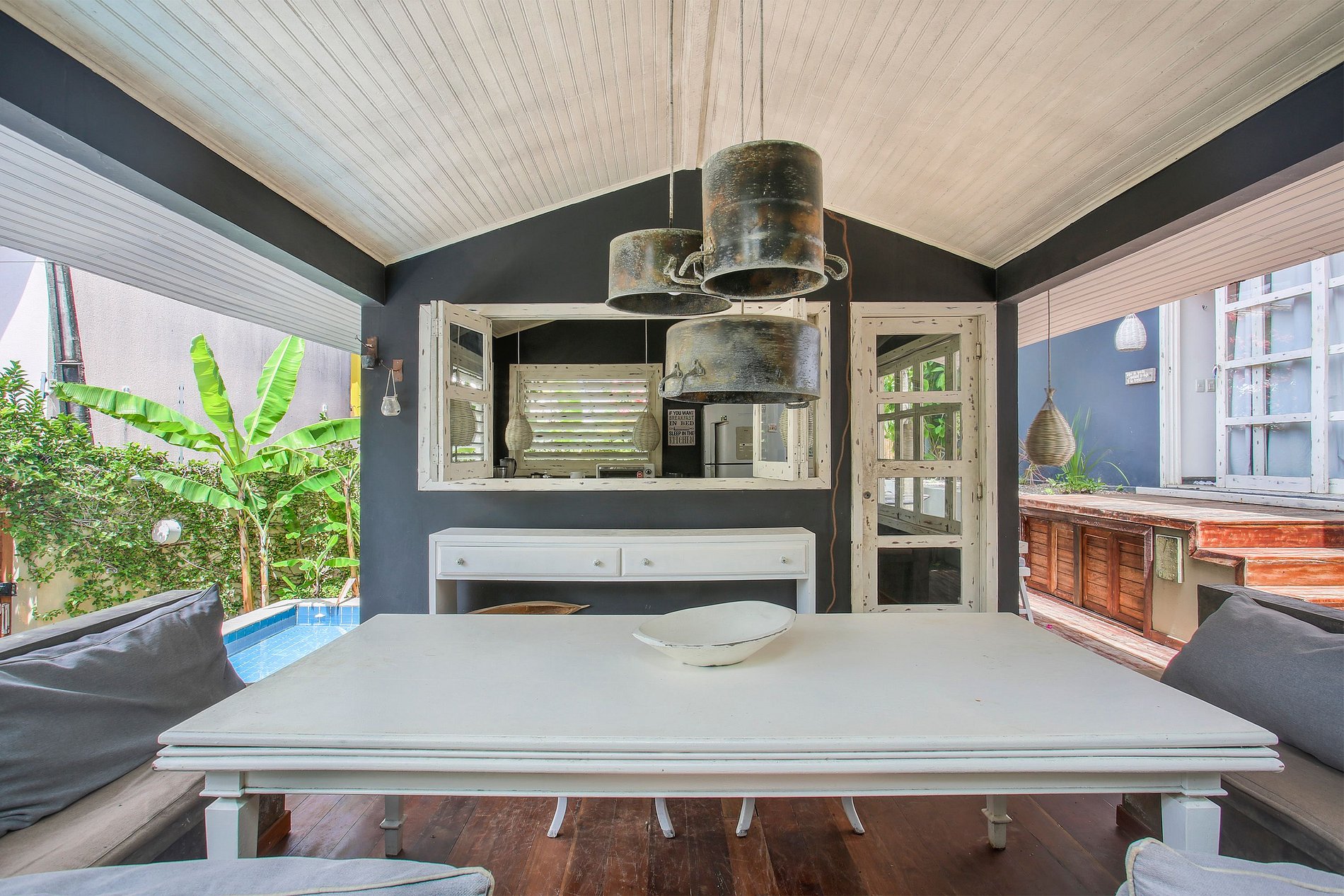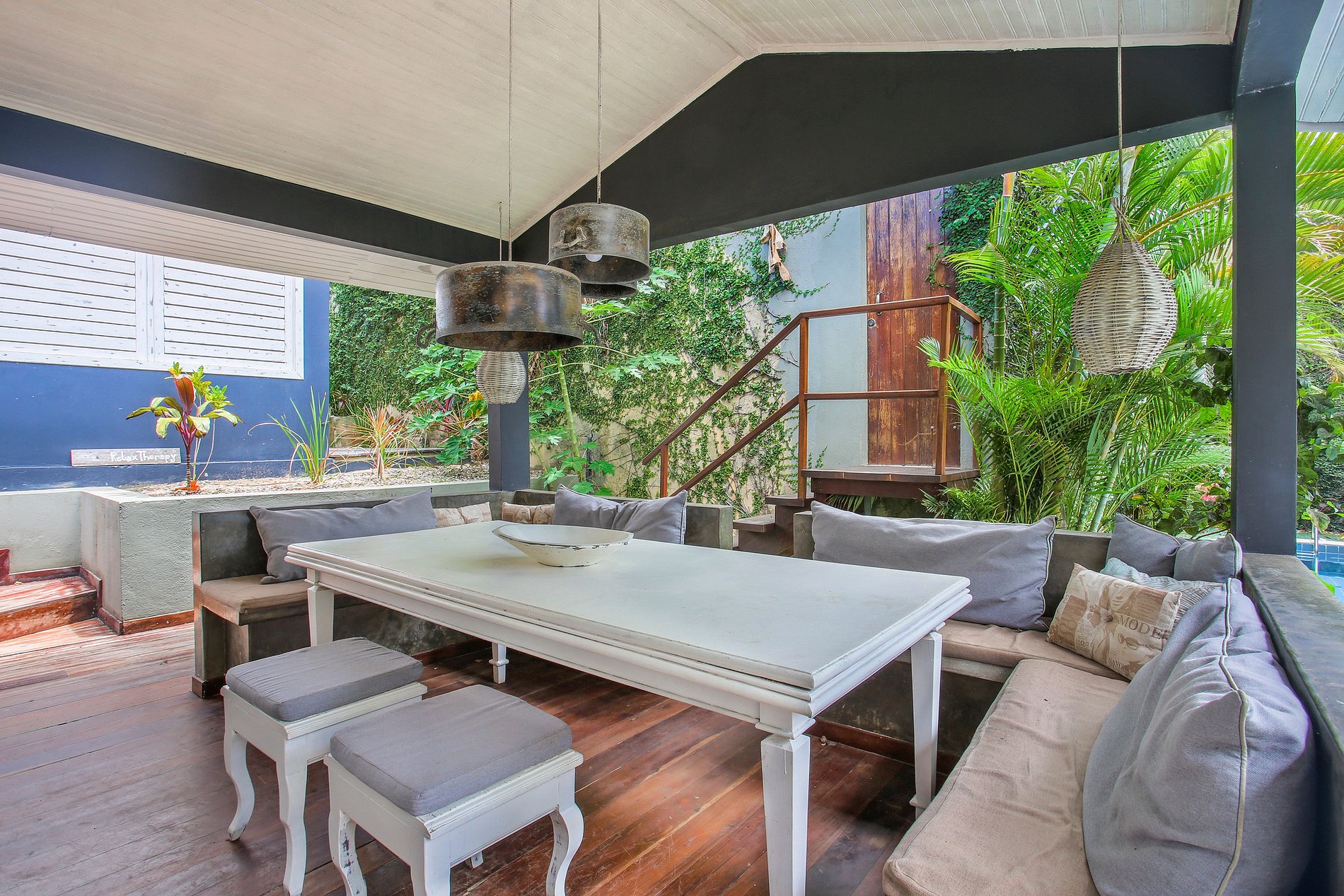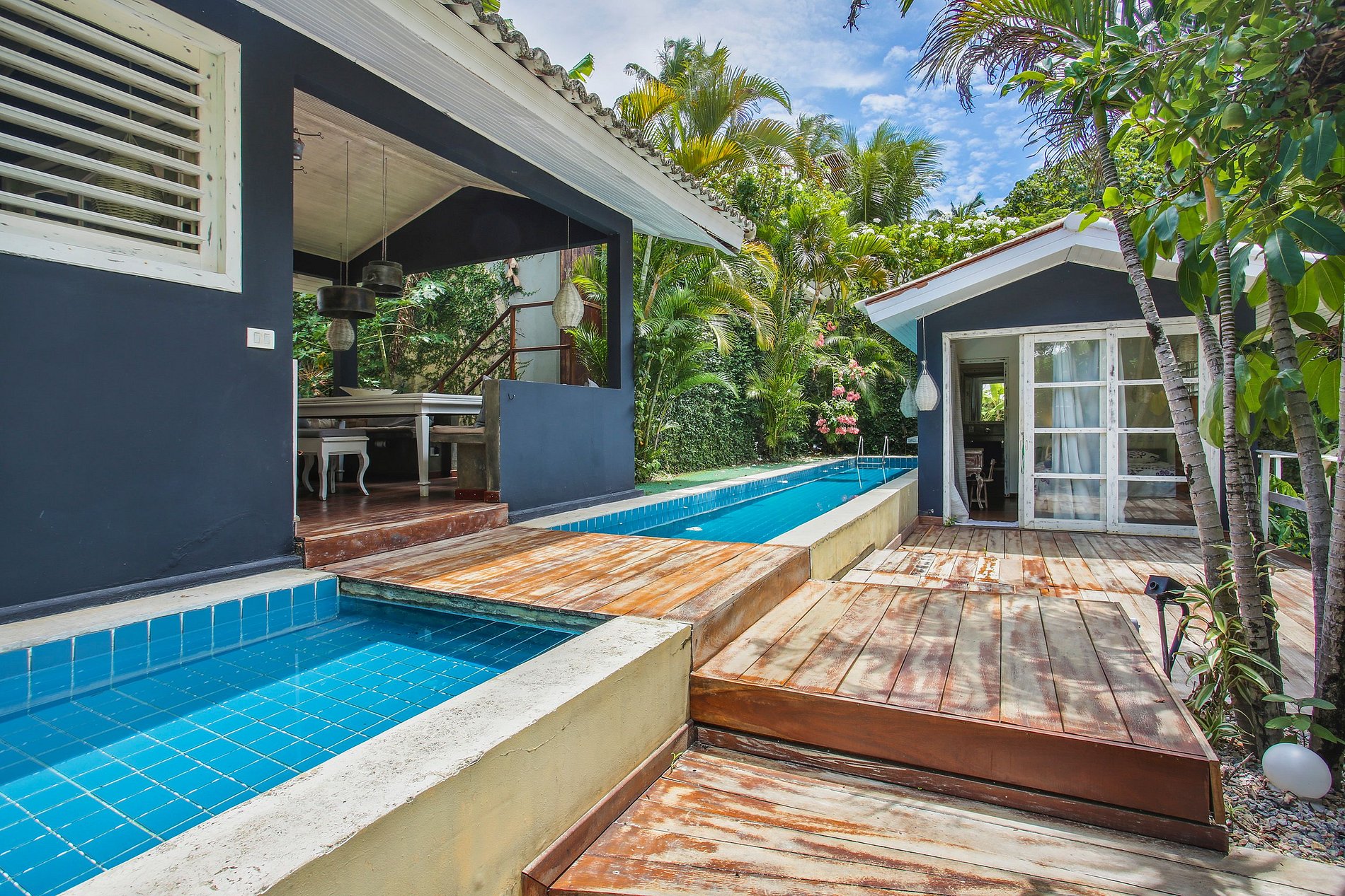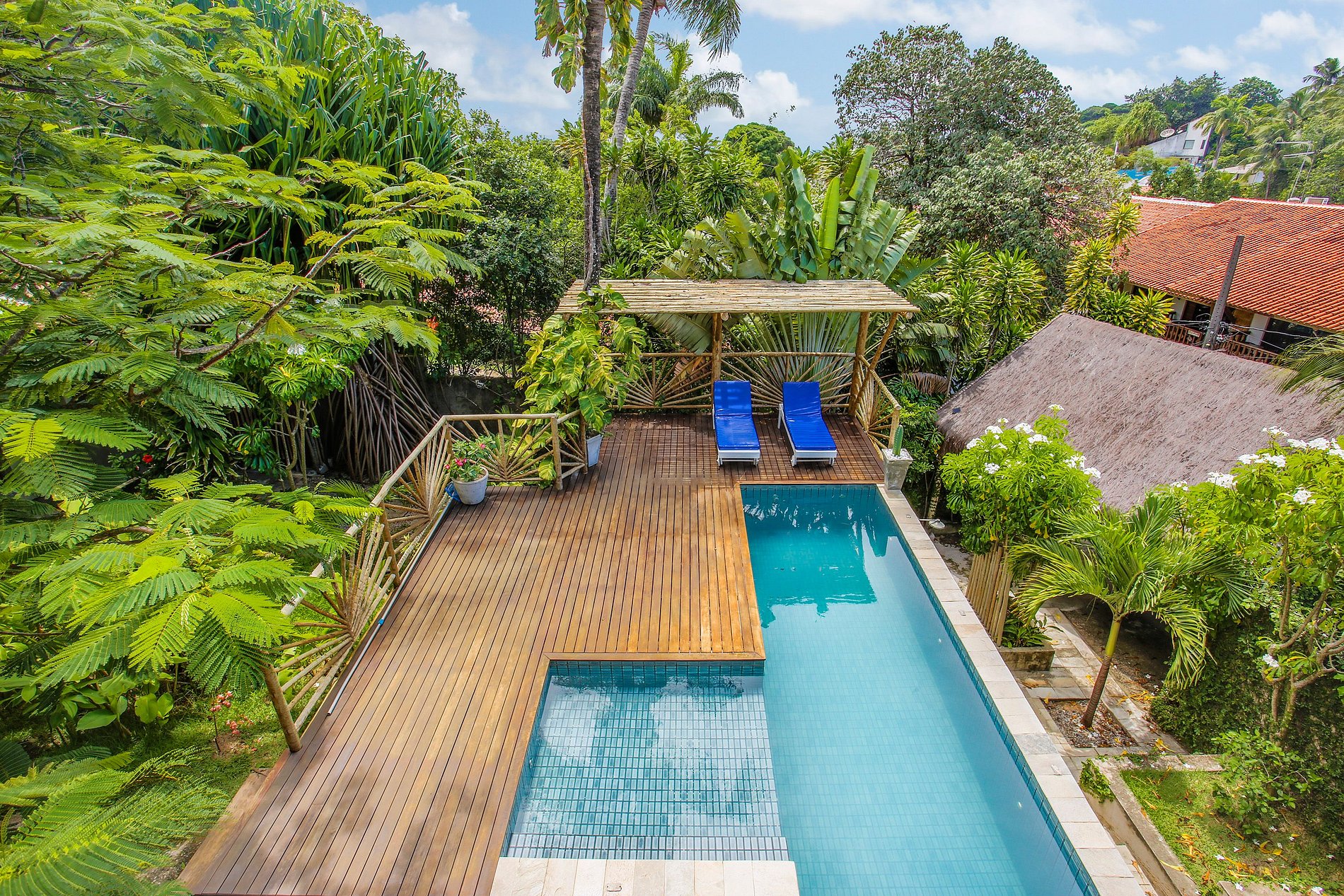 A área externa é um dos grandes destaques da propriedade. A casa conta com uma linda piscina privativa com deck de madeira, espreguiçadeiras e amplos espaços para descanso. Ao redor, palmeiras e árvores tropicais criam uma atmosfera tranquila e reservada. A área social integrada inclui uma agradável sala de estar externa e um espaço gourmet, ideal para reunir amigos e família para refeições, drinks ou simplesmente aproveitar o clima de Pipa.