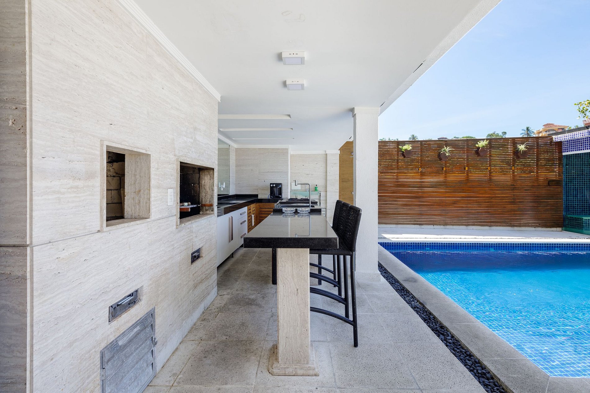 O interior luxuoso desta mansão não deixa nenhum desejo por cumprir. As salas de estar e de jantar são muito abertas e amplas, concebidas com tectos altos - modernos e confortáveis ao mesmo tempo. Há também um bar alinhado à sala de estar que dá ao lugar uma atmosfera relaxante, com certeza você passará algumas noites inesquecíveis com o seu amado aqui. Além disso, o local possui um espaçoso ginásio equipado profissionalmente e uma sauna. Todas as 6 suítes estão alinhadas ao oceano com grandes janelas panorâmicas, garantindo a incrível vista de todos os ângulos da mansão. Além disso, todos os quartos estão vindo com ACs, TVs a cabo e banheiro privativo.