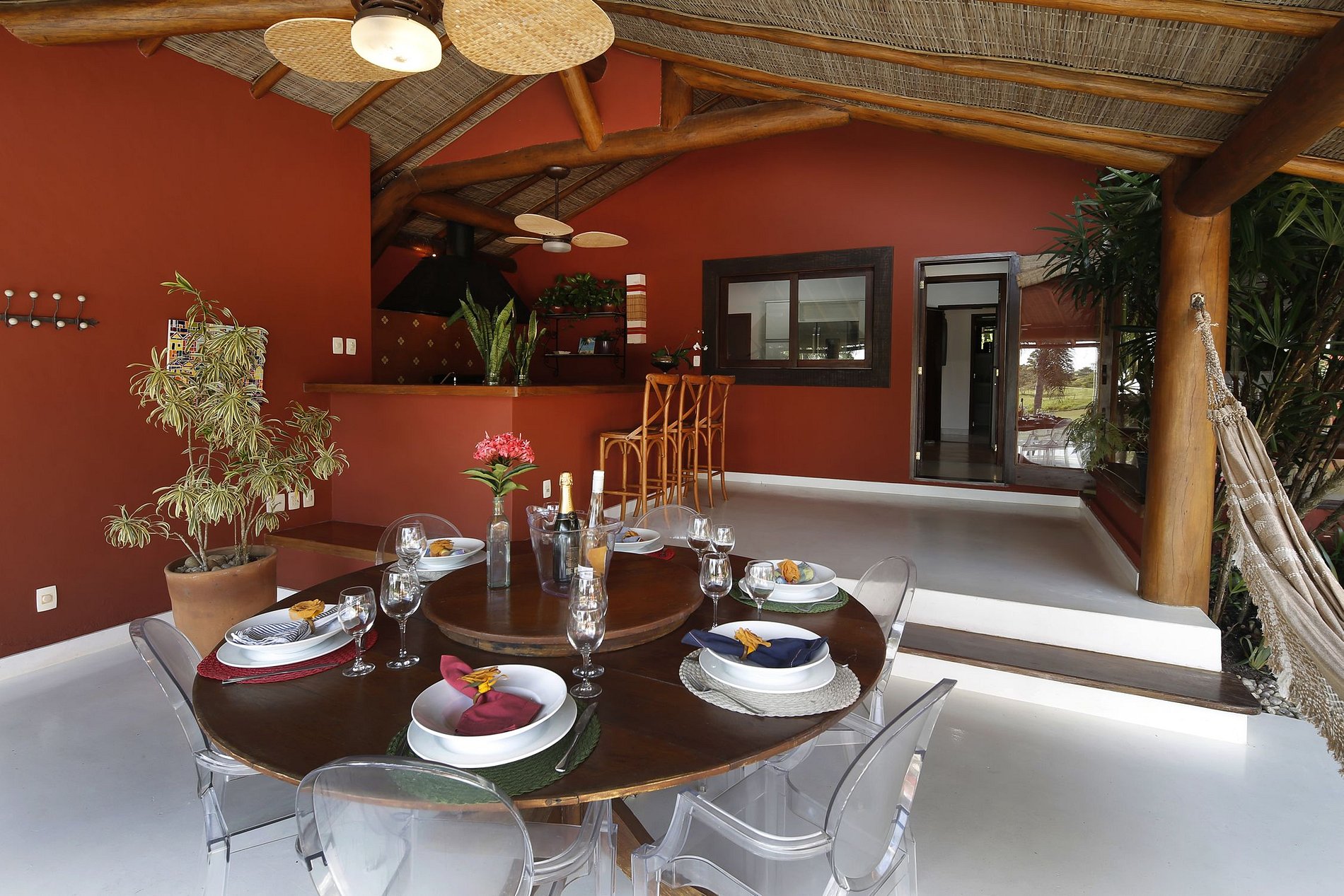 O destaque da vista do campo de golfe é o lago natural que gera uma atmosfera tão bucólica. Os espaços internos, com pé direito alto, oferecem áreas luxuosas e confortáveis para os seus hóspedes privilegiados. Vocês vão aproveitar de 04 luminosas e elegantes suites, sala de TV, sala com sofá, área de jantar com vista na piscina.