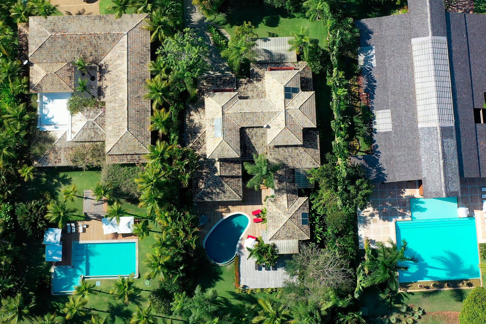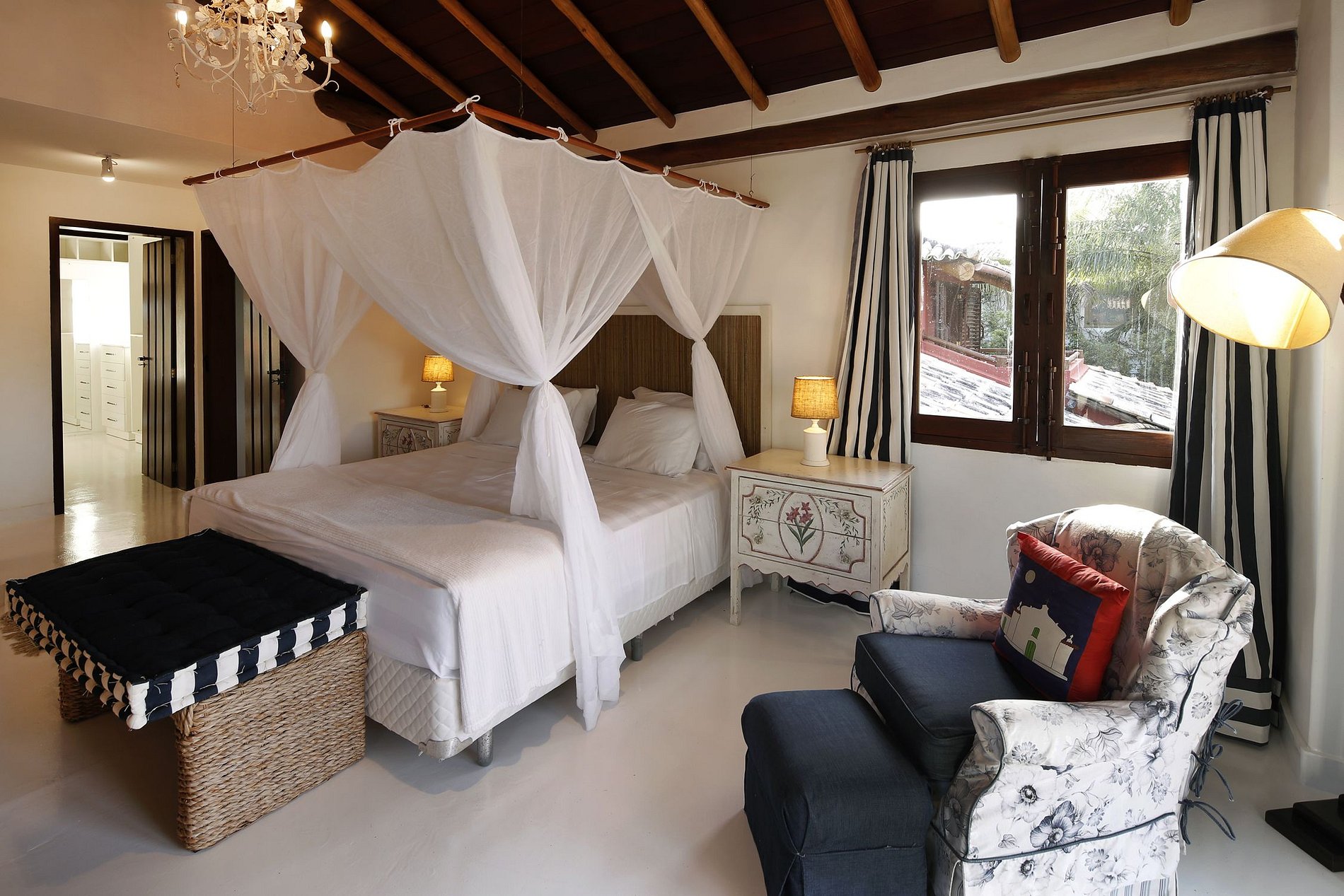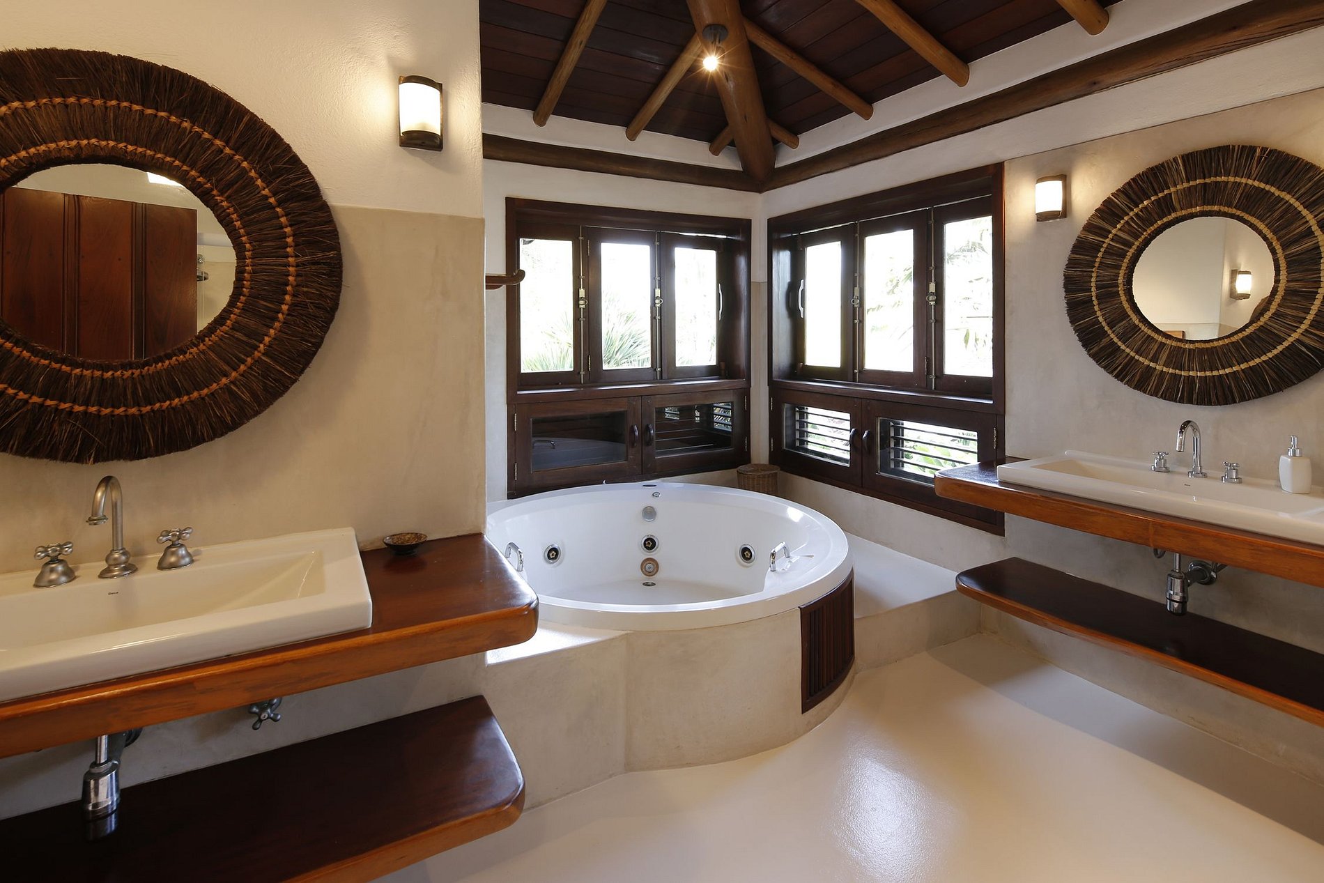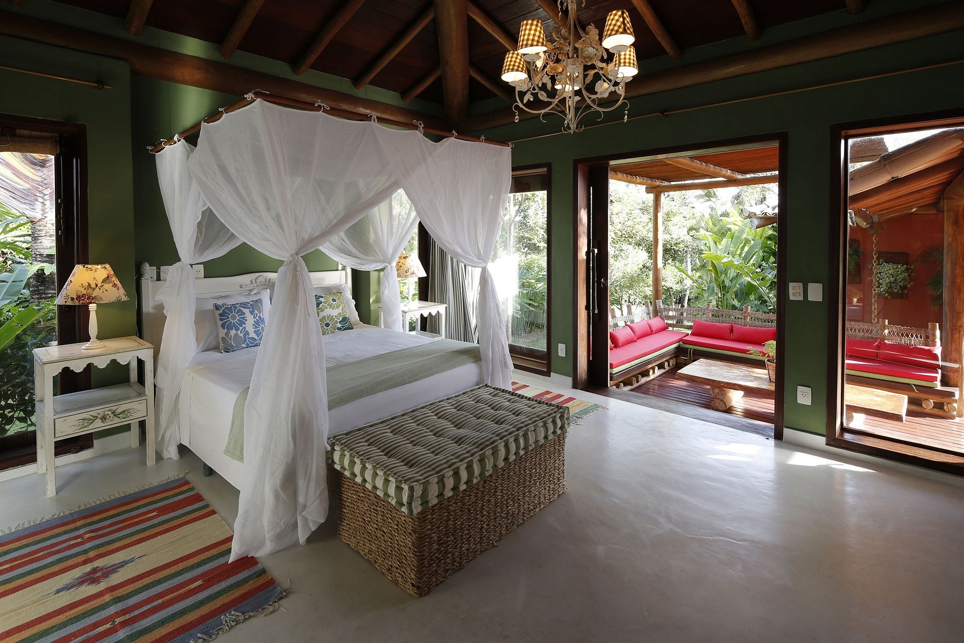 No andar superior desta casa única a suíte master vem com um banheiro espaçoso e luxuosamente equipado, que possui um jacuzzi, ótimo para relaxar seu corpo e mente depois de um dia cansativo no campo de golfe ou em Trancoso com as praias de areia, além de uma segunda suite com duas camas de solteiro e mais duas suites no térreo, duas suites independentes sendo uma com cama de casal e a outra com duas com camas de solteiro e uma bicama. No total a propriedade tem uma capacidade total para 10 convidados.