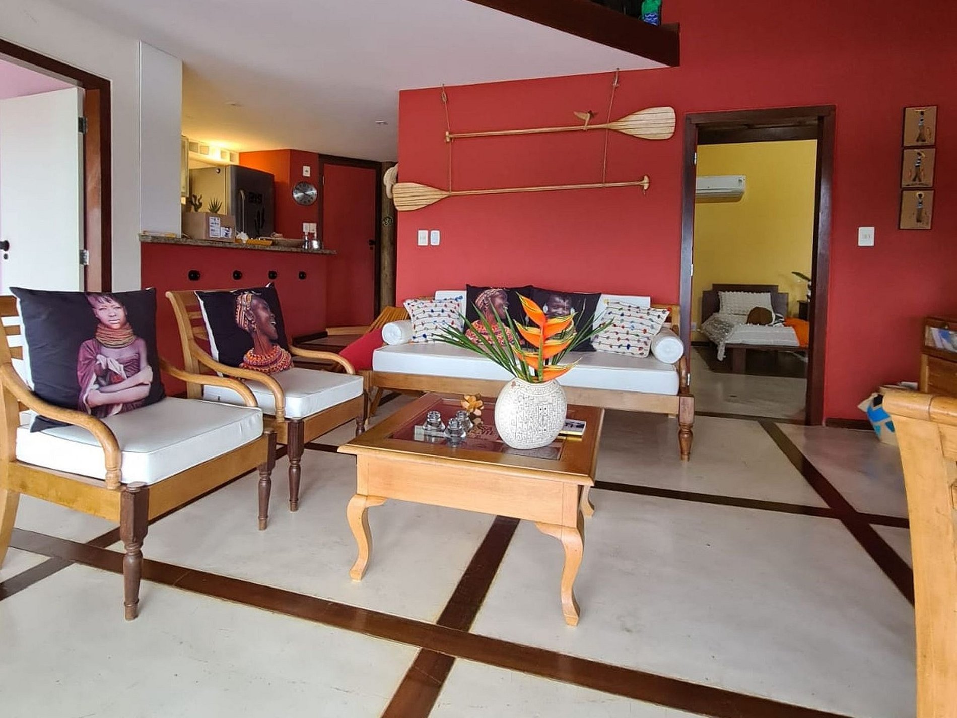 Sua sala de estar climatizada foi cuidadosamente mobiliada e decorada com moveis e decoração local, ela conta com tv a cabo e possui acesso direto a extensa varanda com piscina.
