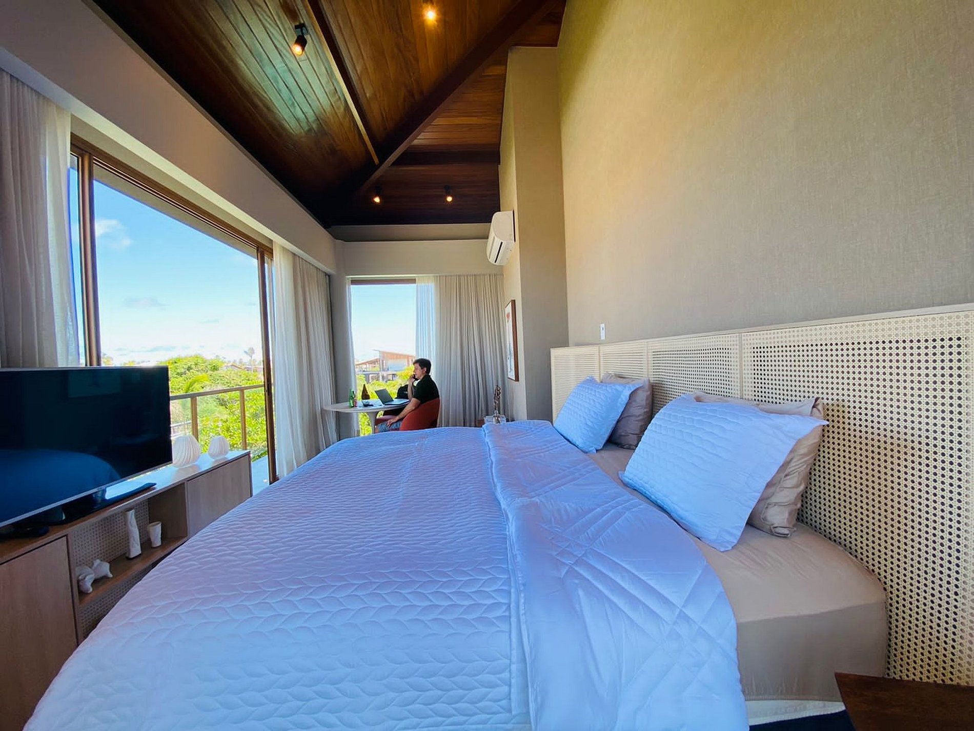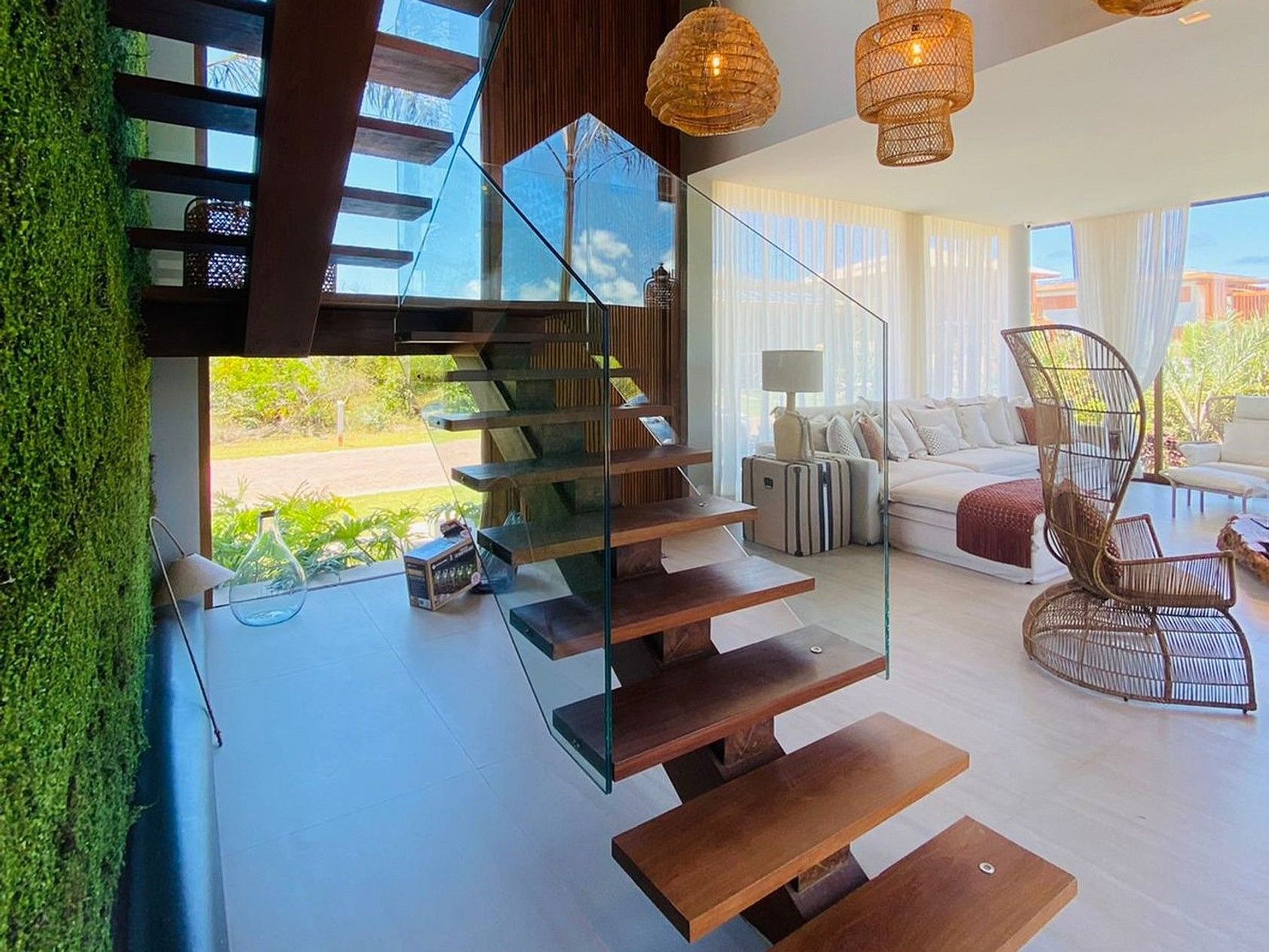 Esta fabulosa casa de 2 andares impressiona logo em sua fachada. Com belo jardim, duas palmeiras postas uma de cada lado da grande porta pivotante; que dá acesso ao interior da casa. Projetada em conceito aberto, a casa aproveita com excelência iluminação natural, e também os ventos litoraneos que geram a climatização natural mesmo em dias quentes.