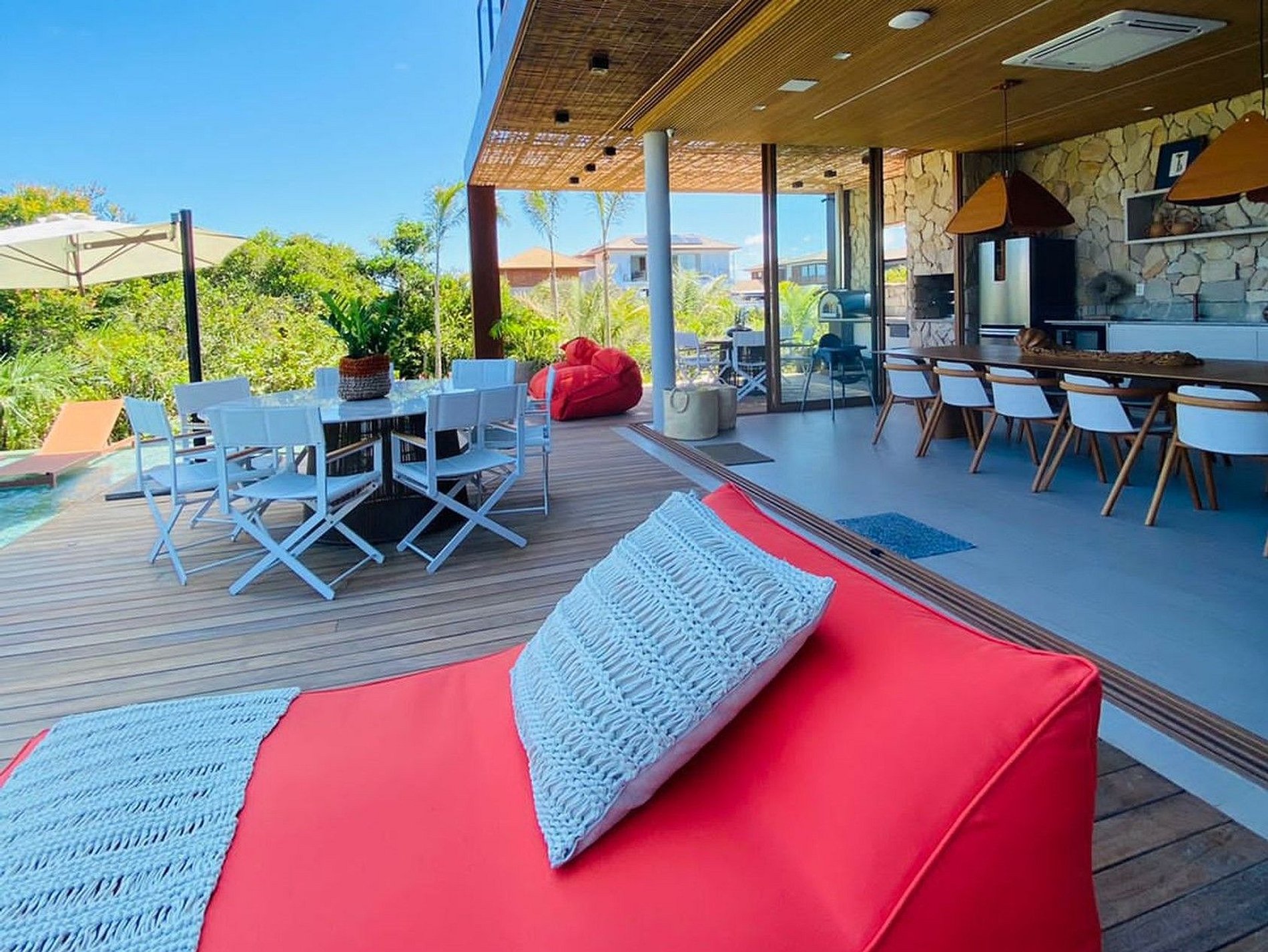 Na área externa da casa está um grande deck com piscina, suas extremidades são rasas e o centro fundo, perfeita para o entretenimento tanto de adultos quanto crianças. Junto a piscina, estão confortáveis sofás e churrasqueira com forno para preparo de pizzas alem de espaço para refeições.