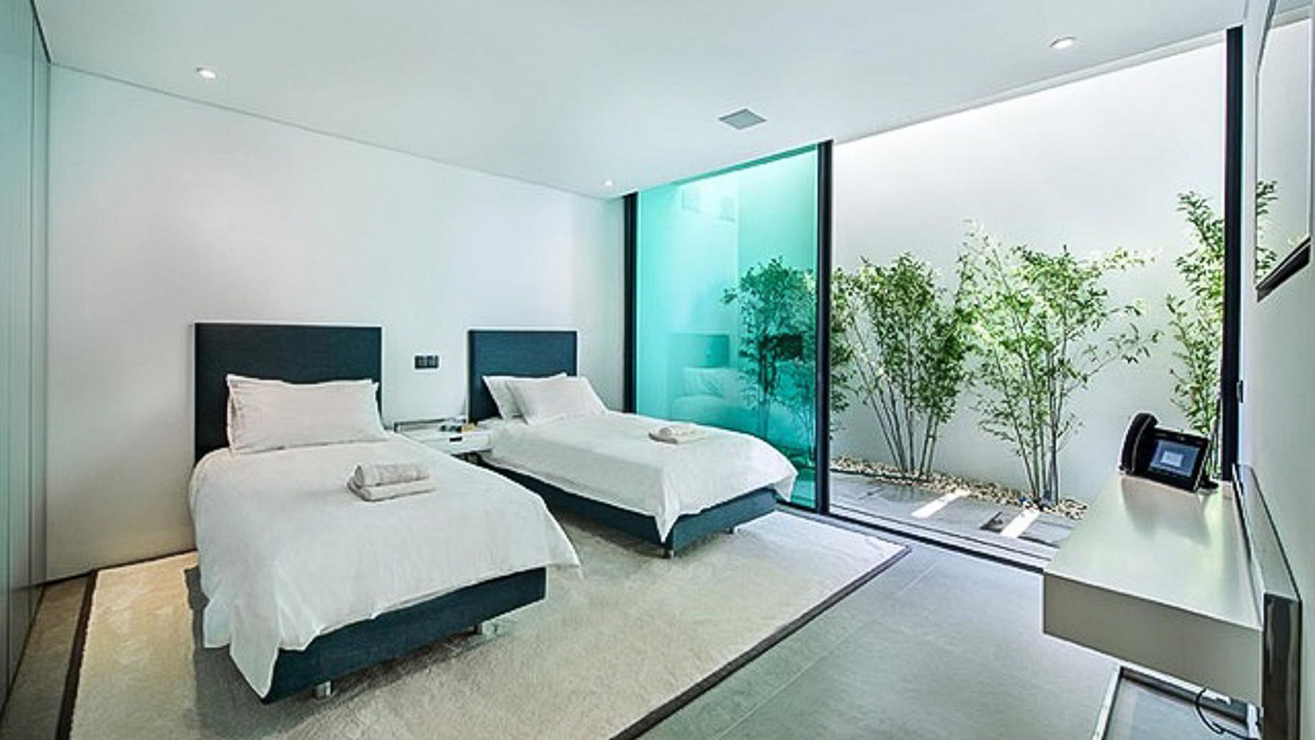 Paredes brancas e pisos claros combinados com as linhas limpas do mobiliário de alta qualidade dão a esta villa uma sensação quase futurista.