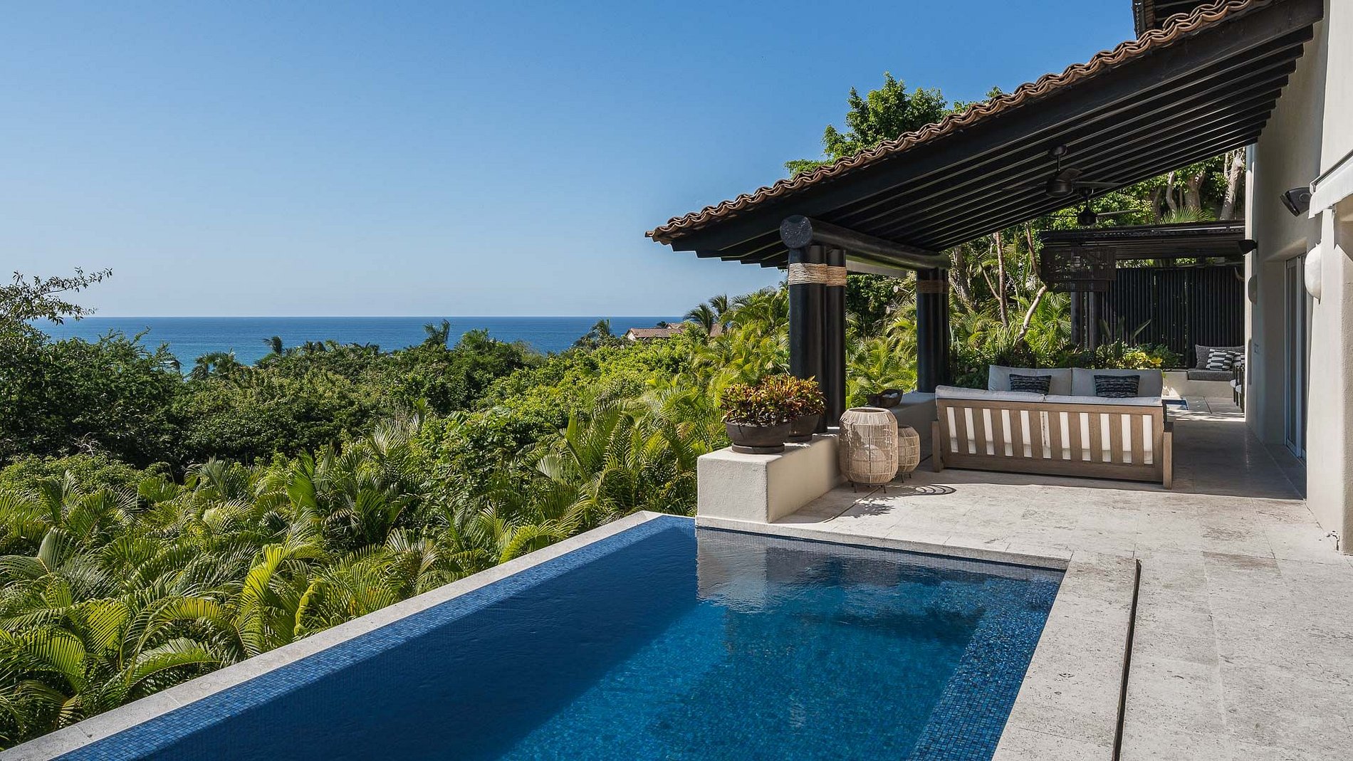A área externa é centrada em uma piscina infinita aquecida e jacuzzi, com espaços de estar e jantar ideais para relaxar e aproveitar o entorno. Os quartos no andar superior capturam vistas para o mar, reforçando a conexão com o cenário natural.