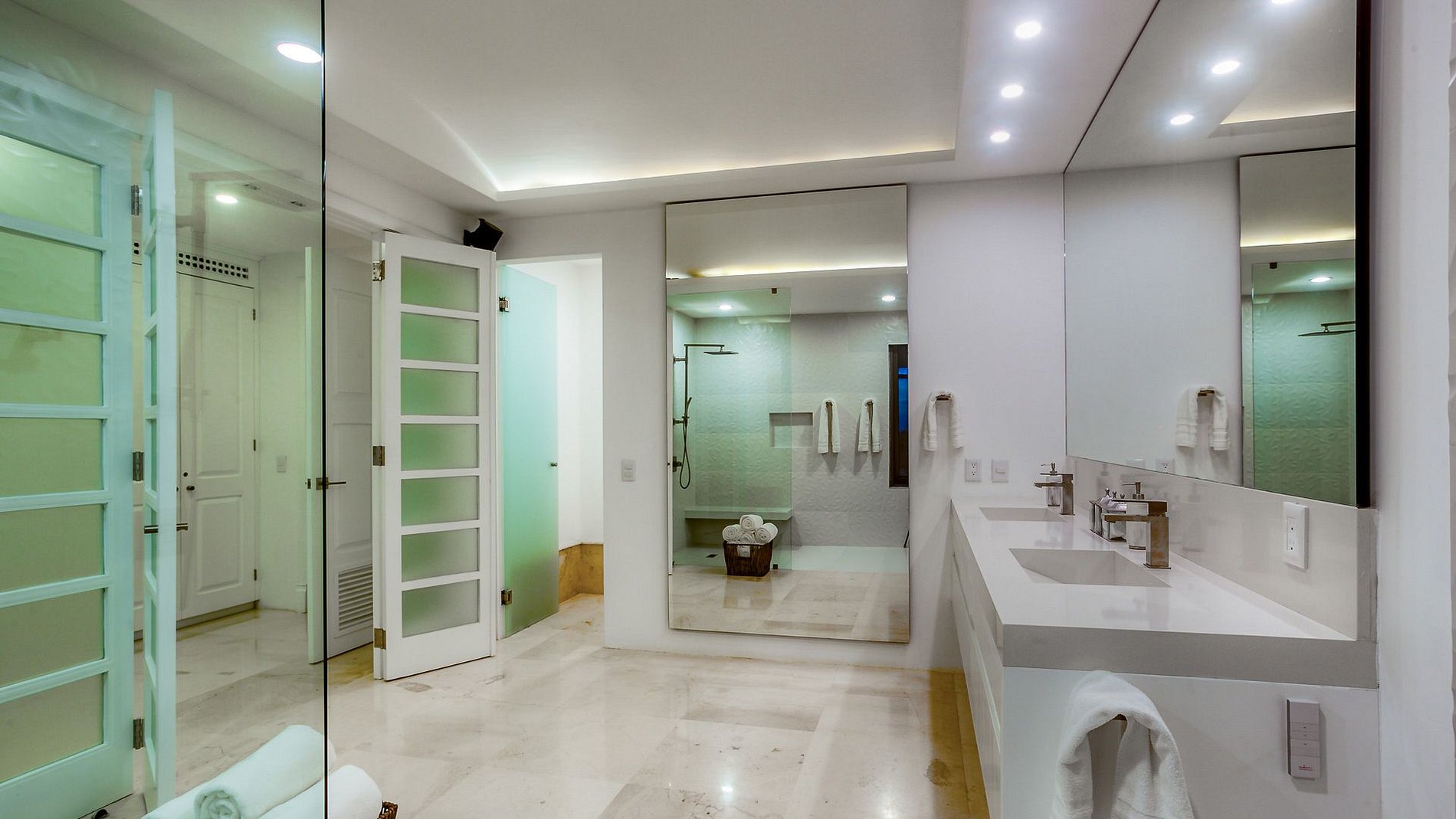 Portas de correr amplas se abrem para um terraço espaçoso com vistas para a piscina, jardins tropicais e o oceano. Este espaço externo foi pensado para relaxar e compartilhar, oferecendo um ambiente perfeito após um dia de praia ou golfe.