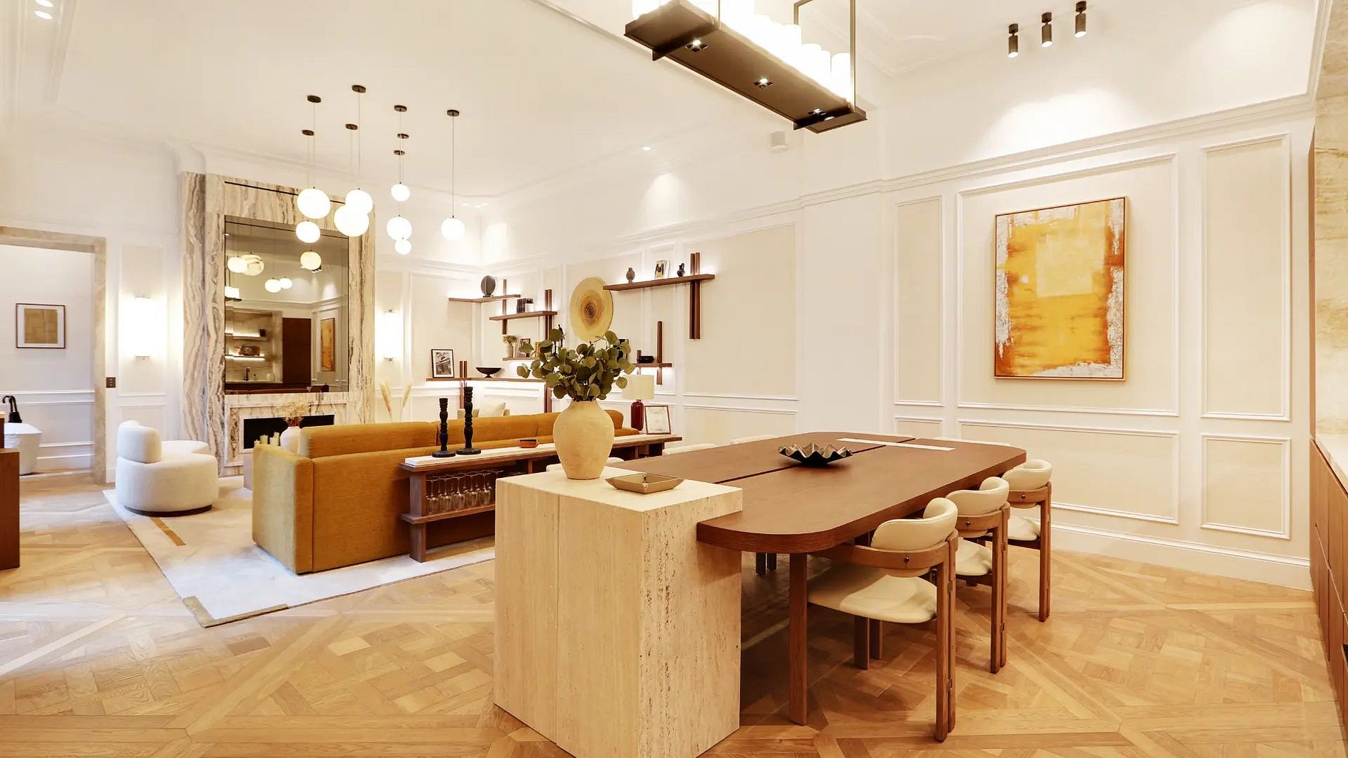 Vale destacar que, do chão ao teto, este apartamento é adornado com materiais de qualidade, nobres e atemporais, incluindo o parquê de Versalhes, mármore ou as várias molduras nas paredes; típico dos apartamentos haussmannianos.