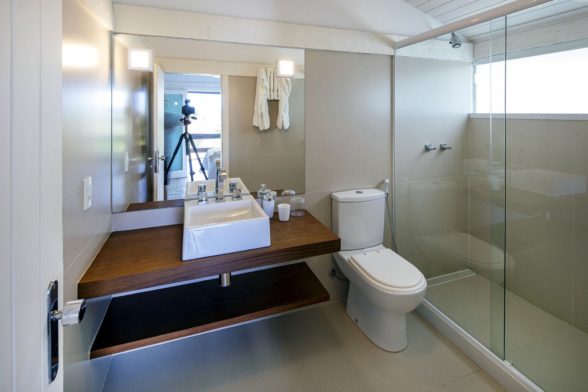 As 5 suítes da propriedade estão todas com banheiro nobre. Você vai encontrar mais um banheiro independente e uma sauna na mansão de 400 metros quadrados. Duas das suítes têm acesso a varandas privativas com vistas incríveis.
