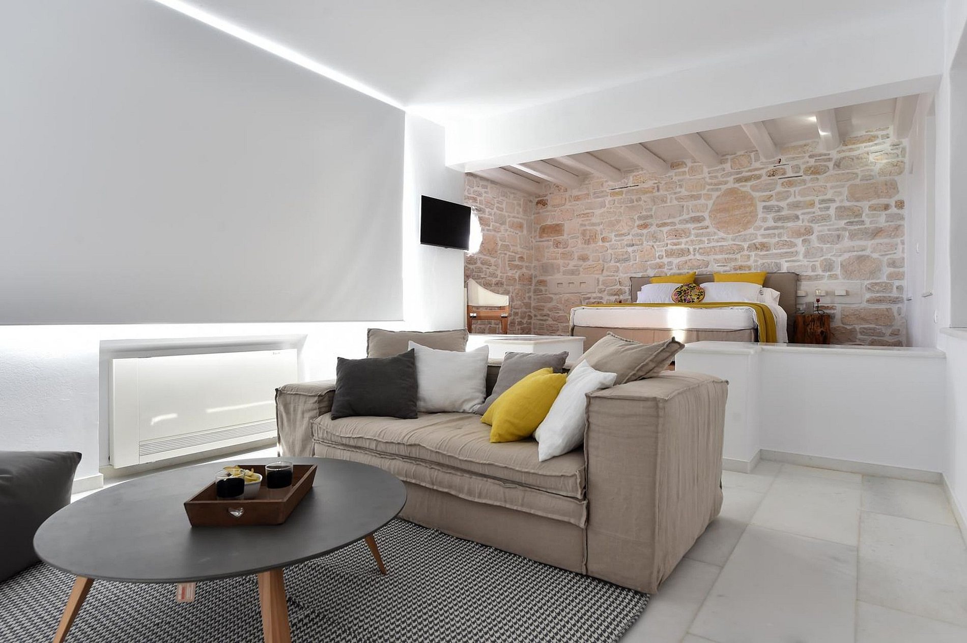 O interior da villa é construído em torno de uma grande sala de estar com vigas brancas expostas e uma elegante sala de jantar com uma mesa de madeira crua. Por outro lado, a sala de estar é construída em torno de uma lareira moderna em mármore de tons de creme.