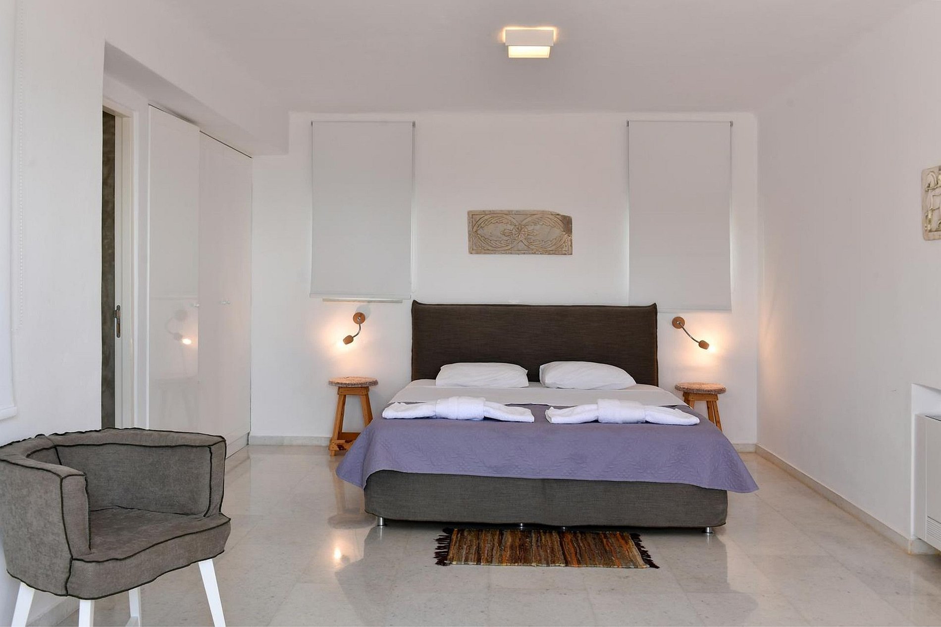 Com capacidade para até 10 pessoas, a propriedade é dividida em uma casa principal e 3 casas de hóspedes. A villa principal é composta por 2 quartos principais em tons naturais de branco e madeira, cada um com banheiro privativo e vista deslumbrante do mar e do sol da manhã.