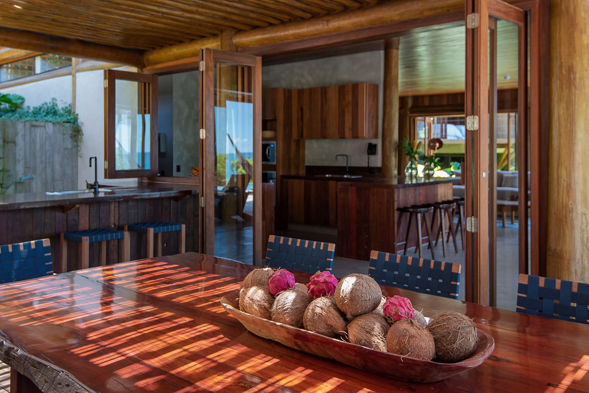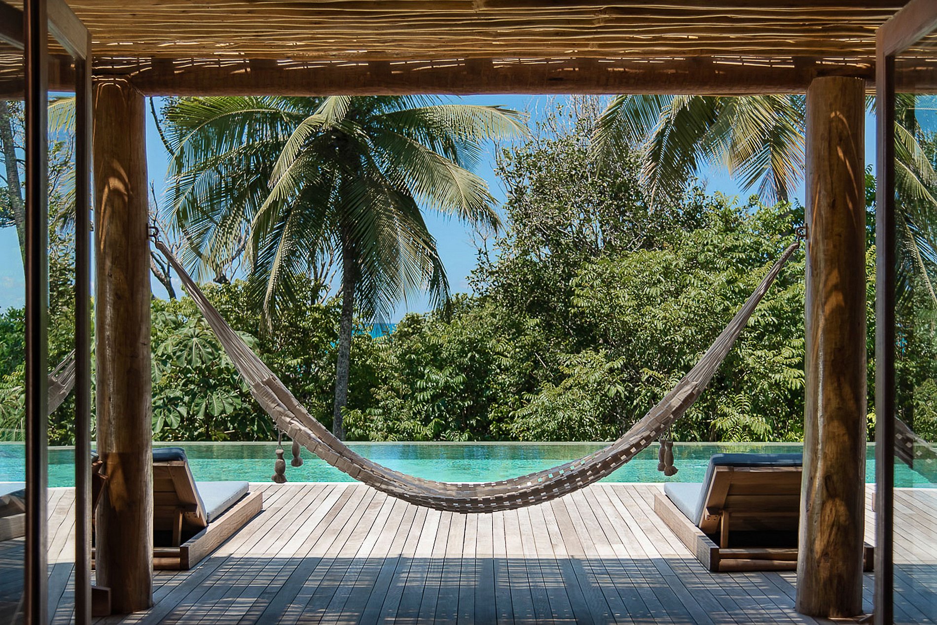 No piso térreo do bangalô central estão o living, a cozinha integrada, a varanda e a piscina com borda infinita. No mezanino, a suíte máster oferece vista panorâmica para a Mata Atlântica e parcial do mar. O quarto anexo é ideal para crianças. As outras suítes estão distribuídas nos demais bangalôs interligados por decks.