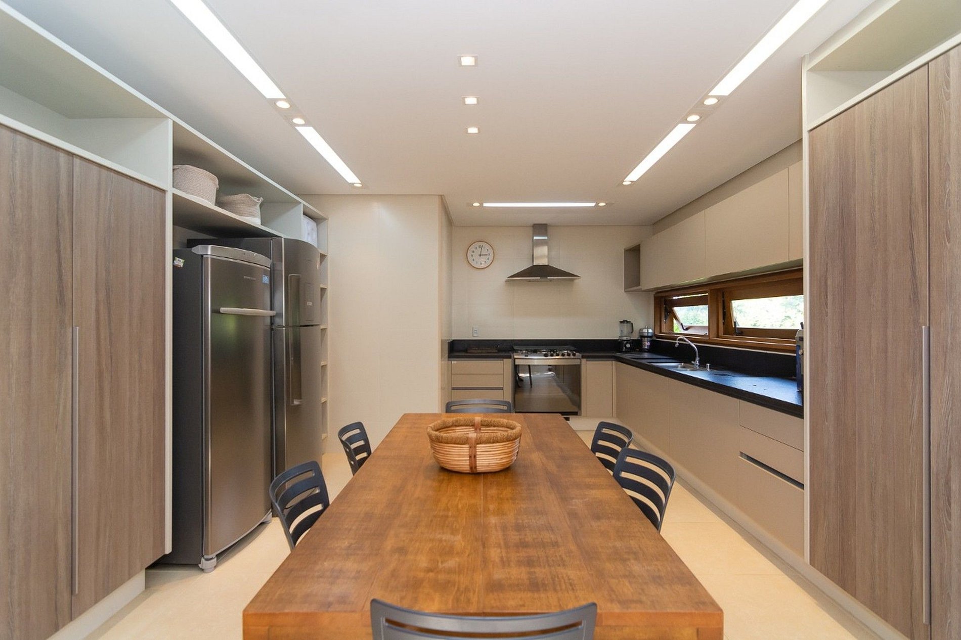 A casa tem 2 cozinhas, a primeira atende a parte interior da casa e enxoval completo para servir até 18 pessoas. A segunda, a chamada Gourmet, atende a área externa. Possuí: churrasqueira, cervejeira, cook top por indução, charbroiller, 2 adegas, geladeira side by side e Televisão. Ambas possuem mesa para refeições e modernos eletrodomésticos para o preparo de excelentes refeições.