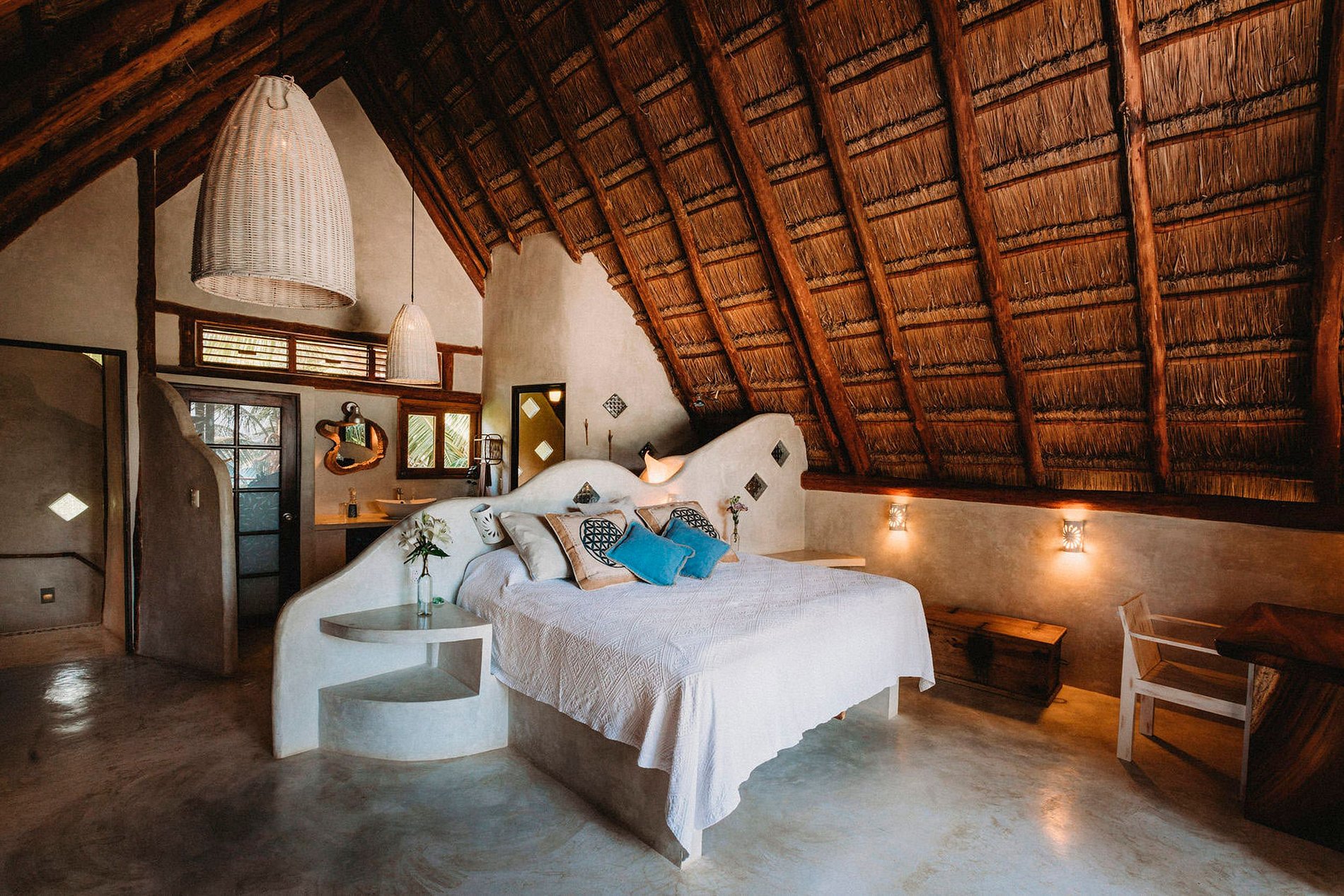 Elementos artísticos e detalhes no interior dão à casa uma atmosfera única da praia de Tulum. Todo o piso superior é o grande quarto principal com uma bela cúpula, cama king-size e varanda com vistas panorâmicas inacreditáveis do mar.