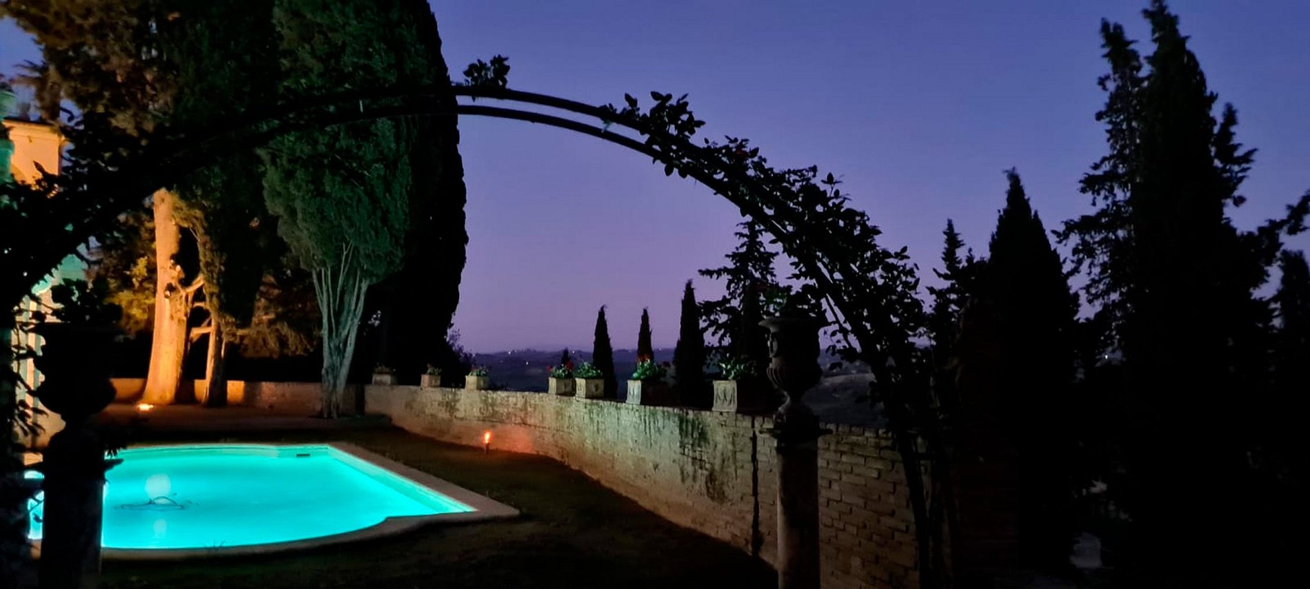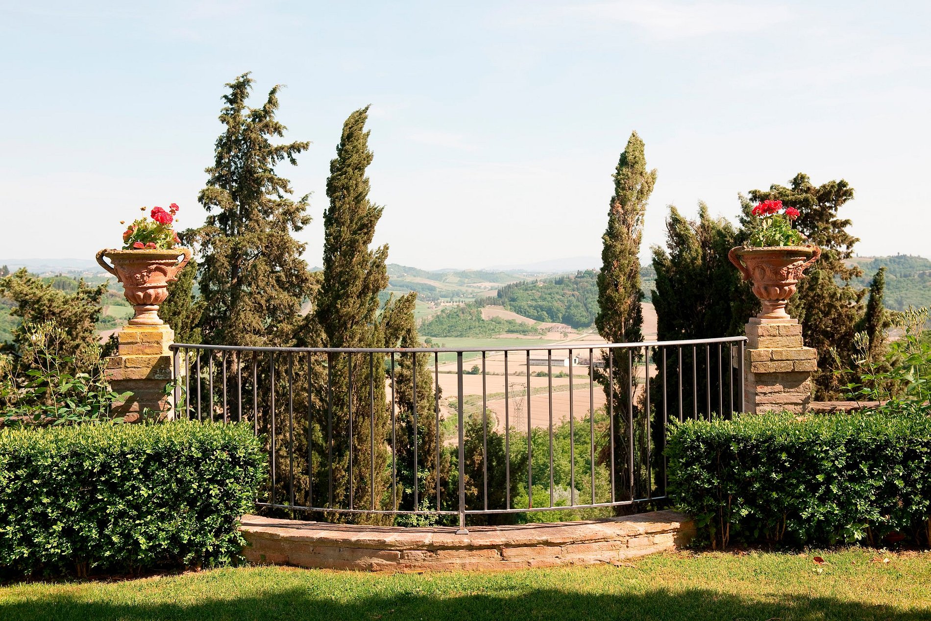 Em frente à Villa, há um grande jardim com uma vista deslumbrante sobre a paisagem toscana, vistas dramáticas sobre a ondulante e fértil paisagem abaixo.