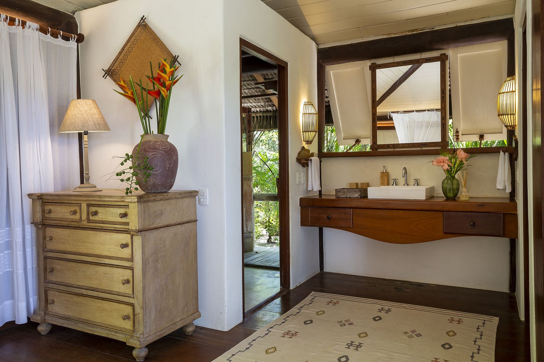 A villa conta com 06 suites bem distribuídas entre casa principal, casa anexo e bangalos. Alguns banheiros segue arquitetura regional de serem abertos com vista para jardim.
