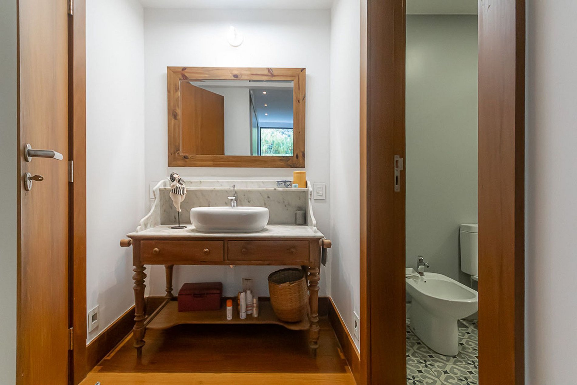 No primeiro andar a casa possui um estacionamento para 2 carros espaço para guarda de bicicletas e elevador para acesso a todos os andares.