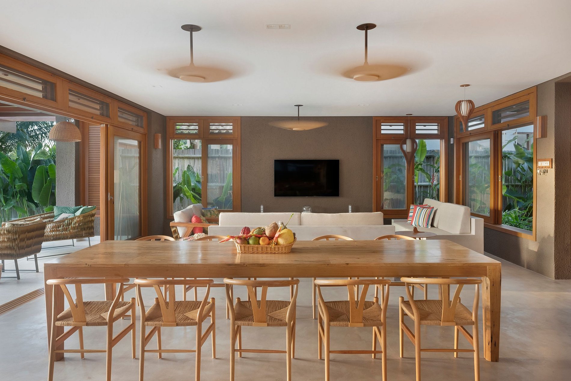 Piso térreo com vão aberto entre cozinha americana, mesa de refeição para 10 pessoas e sofá confortável para TV 55" Stream.