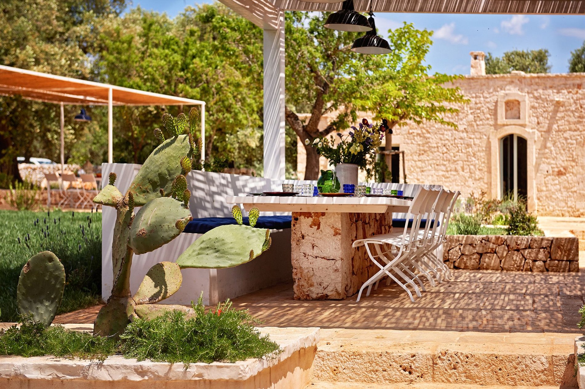Esta coleção está tão misturada com a natureza que praticamente se funde na paisagem fértil que a rodeia. As pedras naturais das calçadas, paredes do perímetro e complexo de edifícios se misturam perfeitamente com os ricos tons de verde e terra da paisagem circundante. Os telhados de ardósia caiada dos trulli, as molduras verde-azuladas das portas e janelas e a piscina deslumbrante no coração do complexo adicionam um toque de cor e alegria.